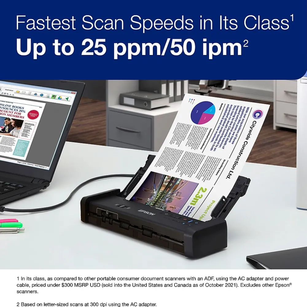 Capture both sides of documents at once with the convenient automatic feeder on this scanner, which also lets you scan and store documents to the cloud for quick collaboration and sharing. This Epson WorkForce portable scanner comes with a TWAIN driver to ensure ease of connection to any document management software.