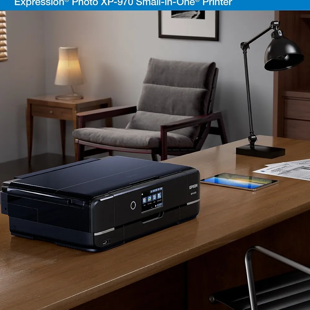 Print professional-quality, wide-format photos with the Expression Photo XP-970 Small-in-One. Producing stunning, borderless photos up to 11″ x 17″, the XP-970 gives your photos astounding vibrancy with 6-color Claria Photo HD Inks. This fast, compact printer delivers 4″ x 6″ photos in as fast as 11 seconds and can even print from smartphones and tablets for easy printing on the go. Designed with your convenience in mind, it includes a 4.3″ touchscreen for PC-free printing and a fold-over scan lid that securely holds originals in place. Plus, with specialty media support, you can print directly onto specialty papers, CDs and DVDs for even more creative flexibility.