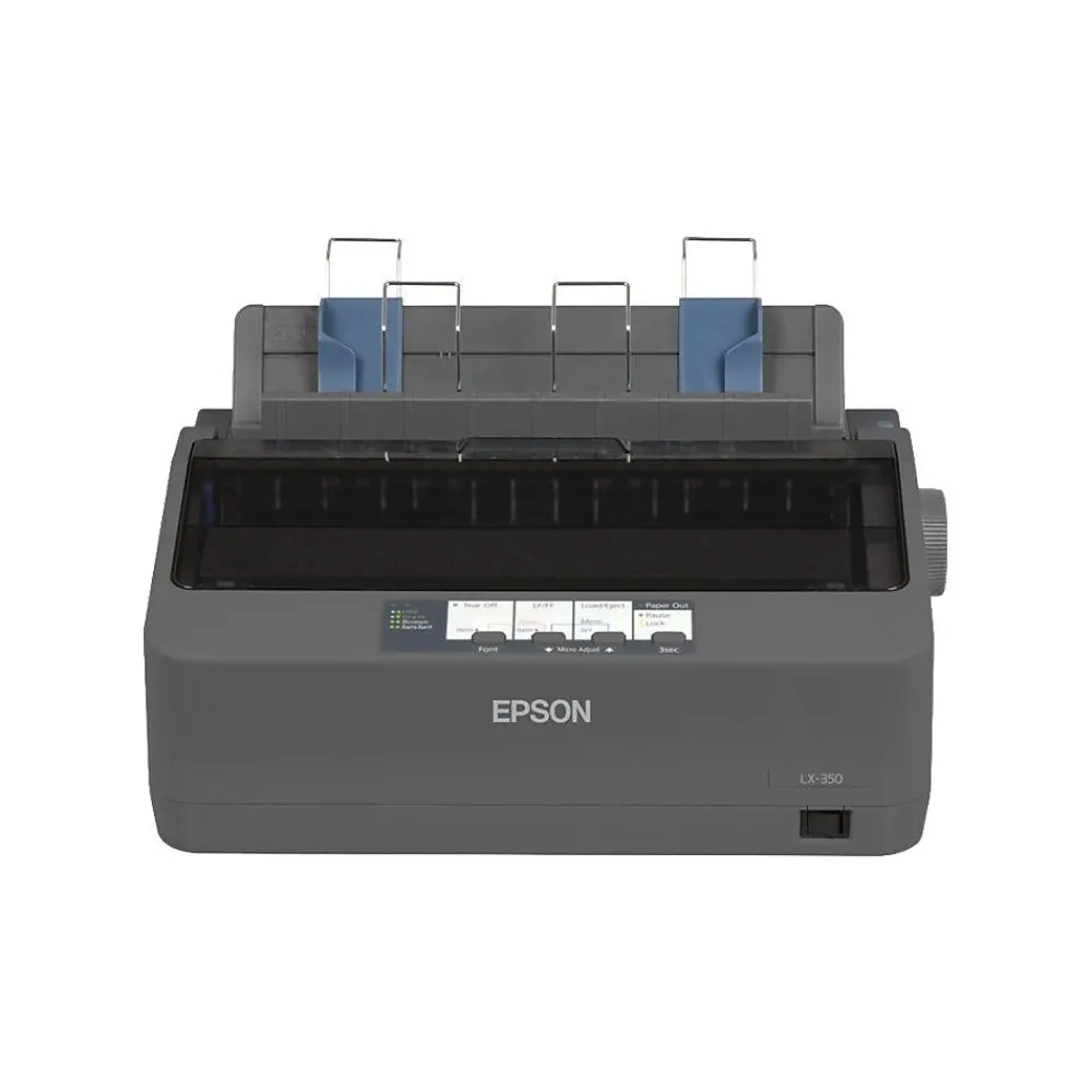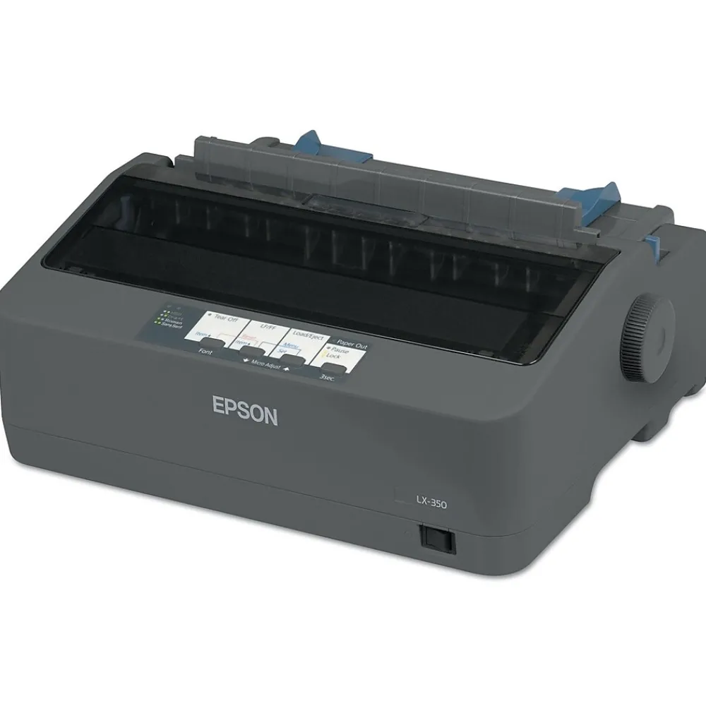 The EpsonĀ® LX-350 black/white dot matrix impact printer features 347 CPS/357 CPS/390 CPS high-speed draft print speed. The manual input loading printer supports continuous forms, envelopes, labels and plain paper media types. The printer includes ribbon, printer driver, quick installation guide, power cable and parallel cable. The printer supports Microsoft Windows 2000/XP/Win 7-8 and Vista., OS.