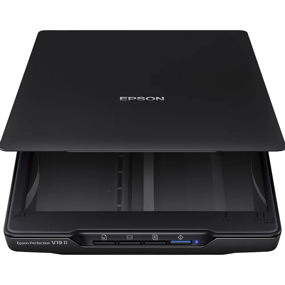 Make scanning simple with the affordable, compact and lightweight Epson Perfection V19 II. With an optical resolution of 4800 dpi, this easy-to-use photo scanner delivers amazing clarity and detail at a great value. The V19 II includes convenient one-touch scanning with easy-to-use buttons, so you can scan directly to PDF or email with just the touch of a button. Get high-quality letter-sized scans in as fast as 10 seconds. Moreover, scan photos, artwork, illustrations, books, documents and more with the included Epson ScanSmart software. If your photos have faded, you can bring back the color in one click with Easy Photo Fix technology. You can also create editable Microsoft Word, Excel and PowerPoint files, or generate searchable PDF files using optical character recognition (OCR) software. The V19 II is USB powered for portability, includes a built-in kickstand for space-saving vertical placement and storage, and features a high-rise, removable lid to accommodate bulky items such as books and photo albums.