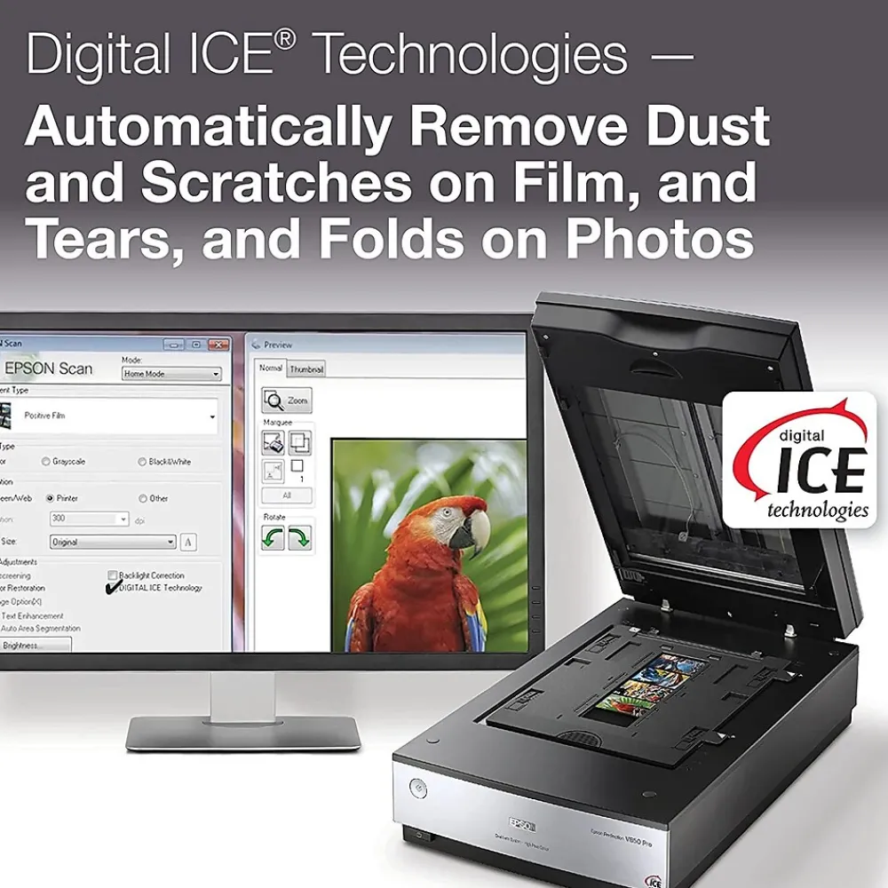- Achieve robust photo restorations: digital ICE technology removes the appearance of dust and scratches on film