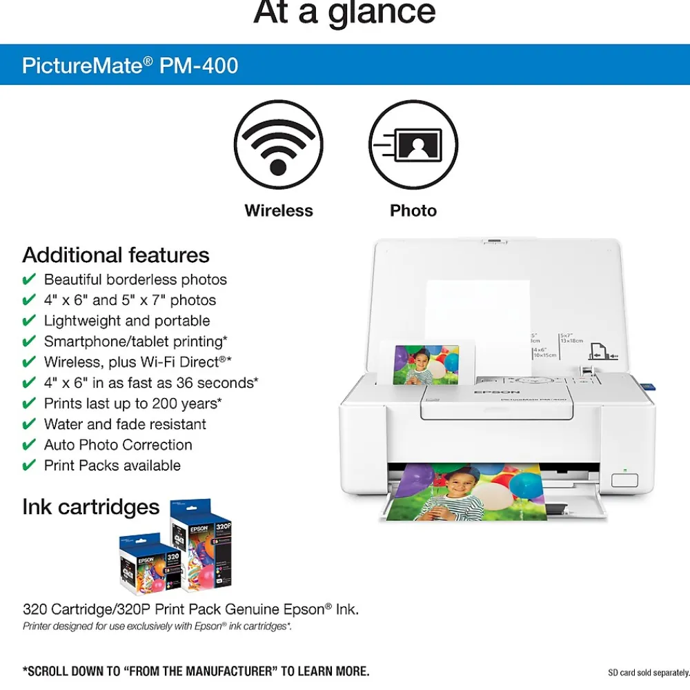 Quickly share that special moment — at family gatherings, parties and more — with the compact, portable PictureMate PM-400 wireless photo printer. This lightweight printer delivers beautiful borderless 4″ x 6″ and 5″ x 7″ photos. Featuring wireless printing, plus Wi-Fi Direct, it prints from your iPad, iPhone, tablet or smartphone. Use the 2.7″ color display to preview photos. The PM-400 prints 4″ x 6″ photos in as fast as 37 seconds. Get stacks of photos with convenient Print Packs (includes ink cartridge and 100 sheets of 4” x 6” photo paper). Photos are smudge, scratch, water and fade resistant and last up to 200 years.