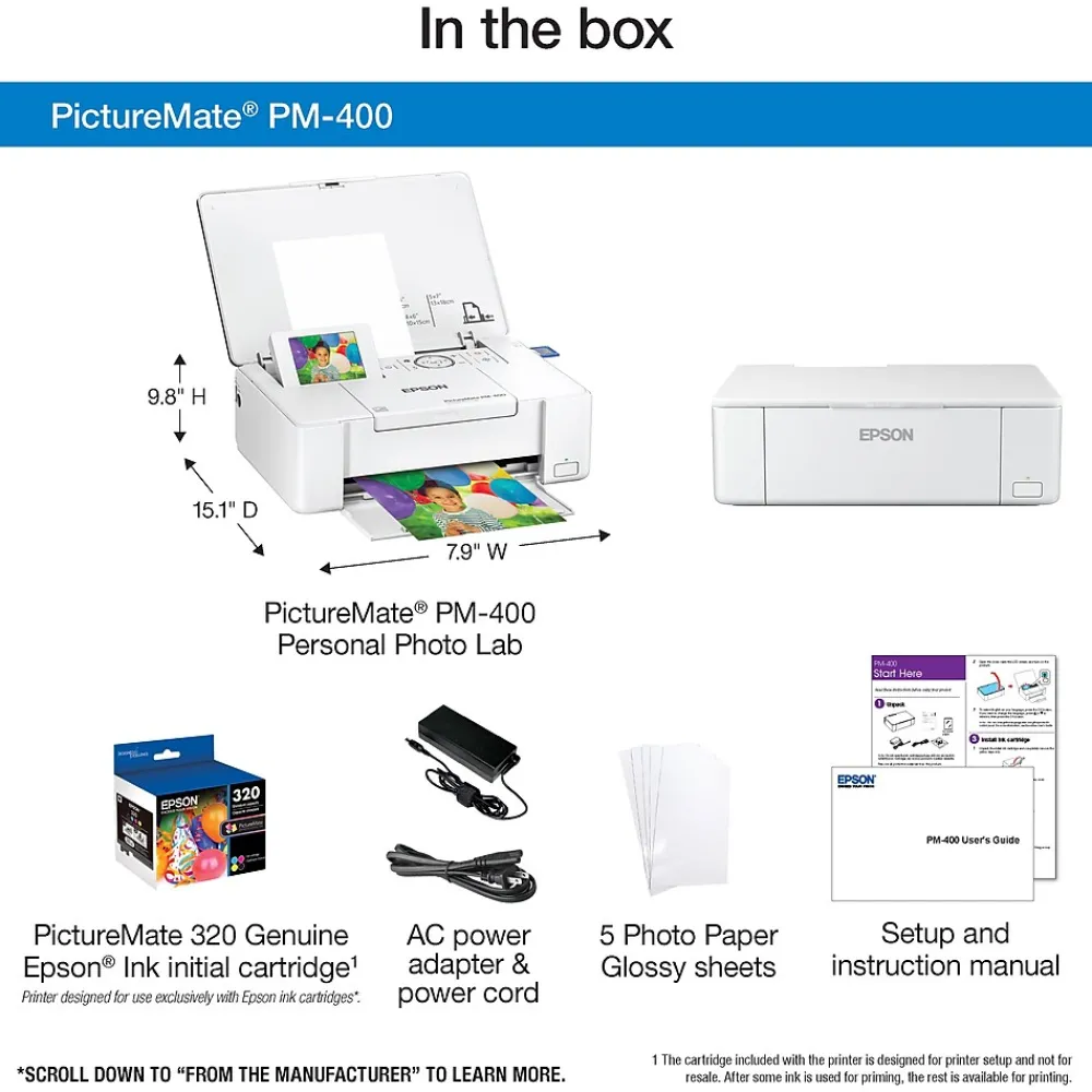 | Display Screen Size (Inches) | PictureMate PM-400, setup and instruction manual, power cord, AC power adapter, 1 ink cartridge (CMYBK) and 5 Photo Paper Glossy sheets |