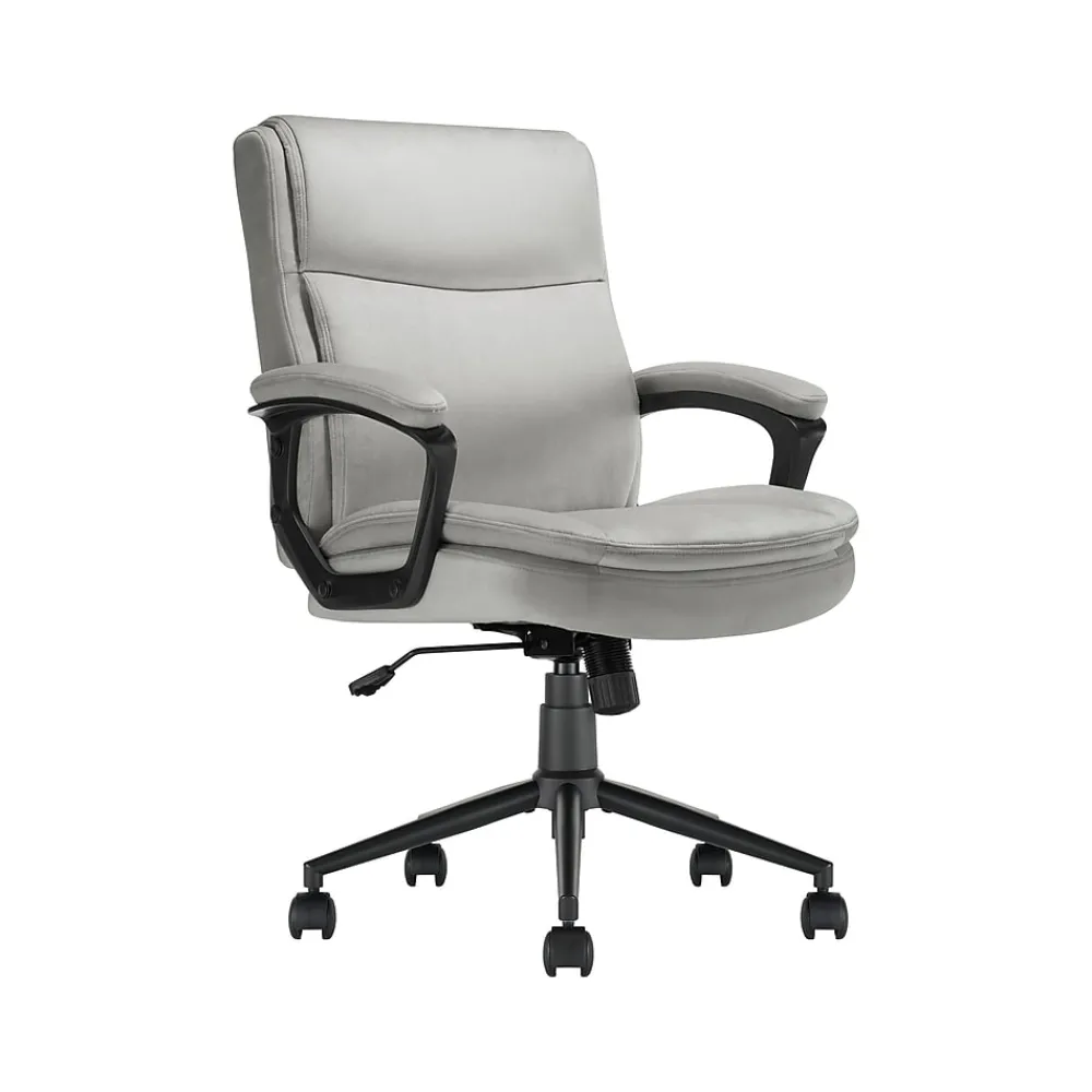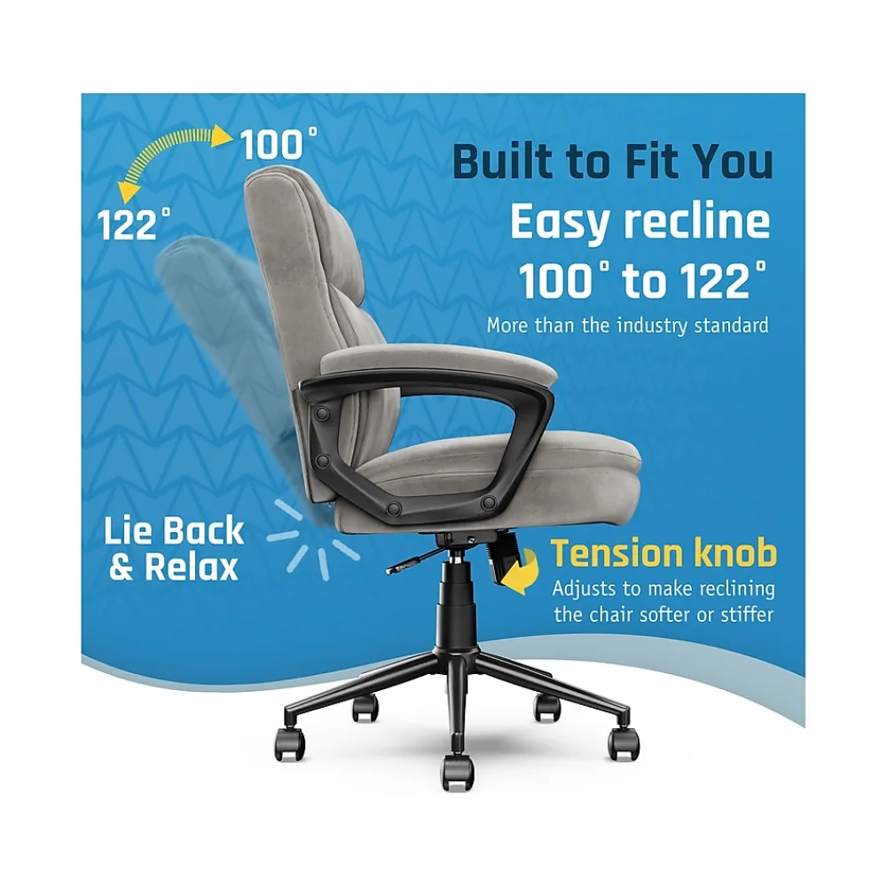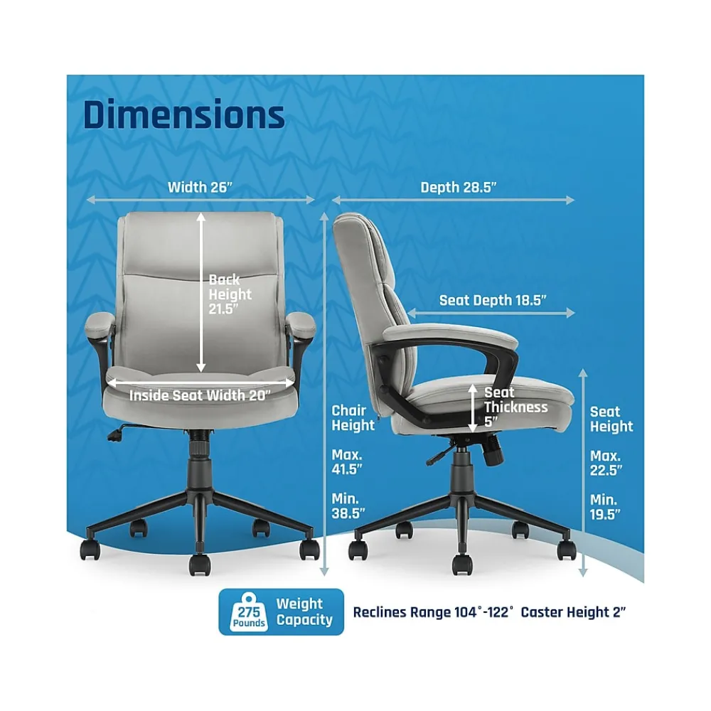 Bring relaxation to your busy workday with the Click365 Transform 2.0 ergonomic mid-back desk chair, which delivers American comfort with ultra plush padding in the headrest, back rest, and seat cushion. This chair has a 5″ thick contoured seat cushion and reliable ergonomic support, providing long-lasting comfort, and is perfect for everyday use at home and in the office. Pneumatic adjustable height, swivel base design, and quality smooth-rolling casters ensure this office chair is easy to move and position. The chair is upholstered in premium durable fabric over high-density foam and boasts a heavy-duty metal base and sophisticated stitching. You can purchase this chair with confidence.