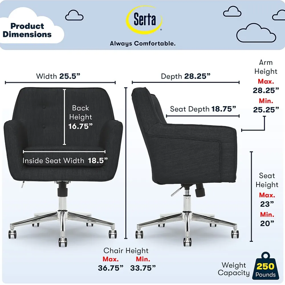 The all-American office chair just got an upgrade! Meet the Serta Style Ashland Home Office Chair. From the chrome-finish base to the memory foam cushions, this beauty is destined to become a classic in your office or home office. Customize your workspace with durable rolling casters that smoothly glide from task to task. With strong, elegant lines and soft upholstered fabric, the Ashland Home Office Chair from Serta can get you through the workweek with style and comfort!