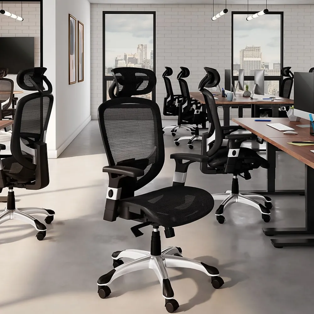 Upgrade your workspace with the Staples Hyken mesh task chair. Designed for productivity and comfort, it offers adjustable armrests and seat height for personalized support. Stay cool with its mesh back, ensuring airflow for prolonged comfort. Easily tailor recline resistance with the tension knob and secure your preferred angle with the upright tilt lock. Its ergonomic build and adjustable lumbar support provide stability and relief, while the five-star base with casters ensures smooth mobility. Meeting ANSI/BIFMA standards, it guarantees safety and performance. Additionally, the adjustable headrest enhances neck support. Say hello to a more productive and enjoyable workday, backed by the assurance of quality and value.