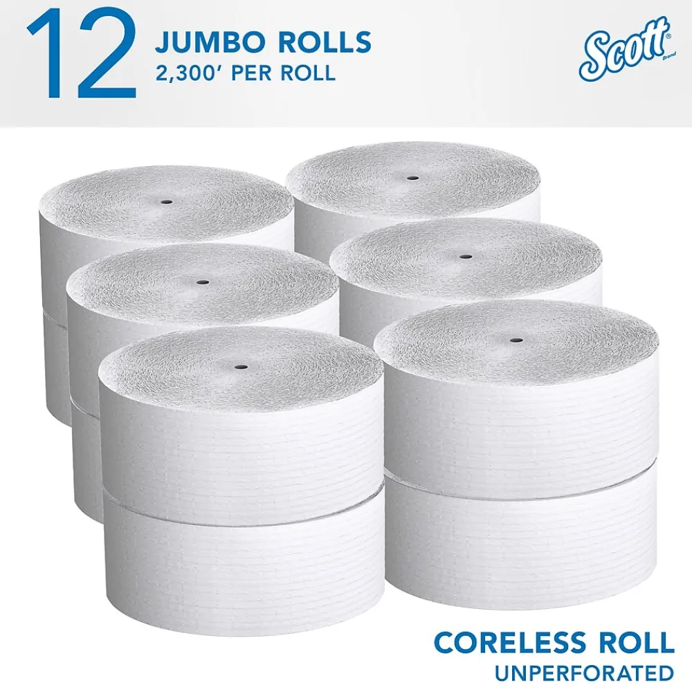 - 2,300’/Roll, 12 ScottĀ® Coreless High-Capacity Jumbo Roll Toilet Paper Rolls/Case; 27,600’/Case; 1-Ply; White