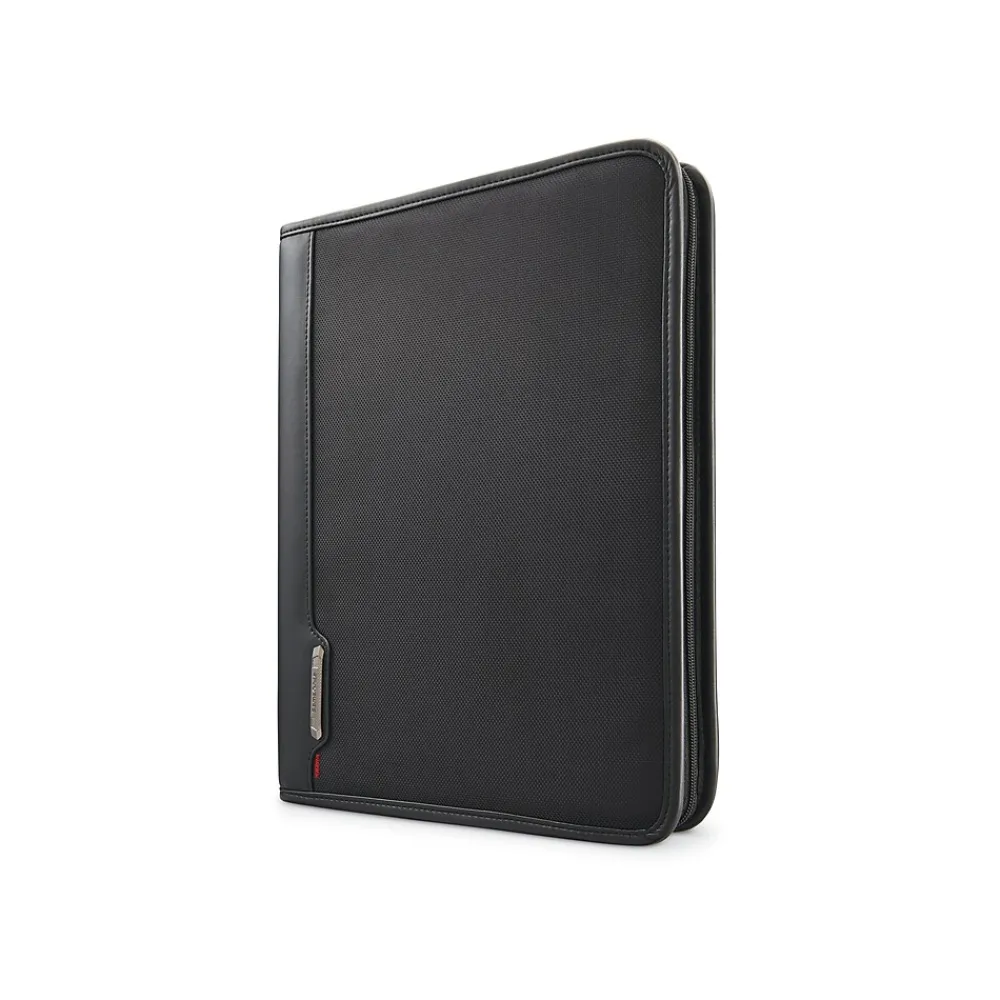 Keep all of your business essentials organized with this Samsonite stylish and compact padfolio. It offers organization for folders, business cards, phone, and tablet. Includes a writing pad and pen loop holder. Features 1″ three-ring binder and secure inner zipper pocket. Made of ballistic fabric with vinyl trim, this classic padfolio comes in steel gray with matte gunmetal textured logo on it and has a 3-year manufacturer limited warranty.