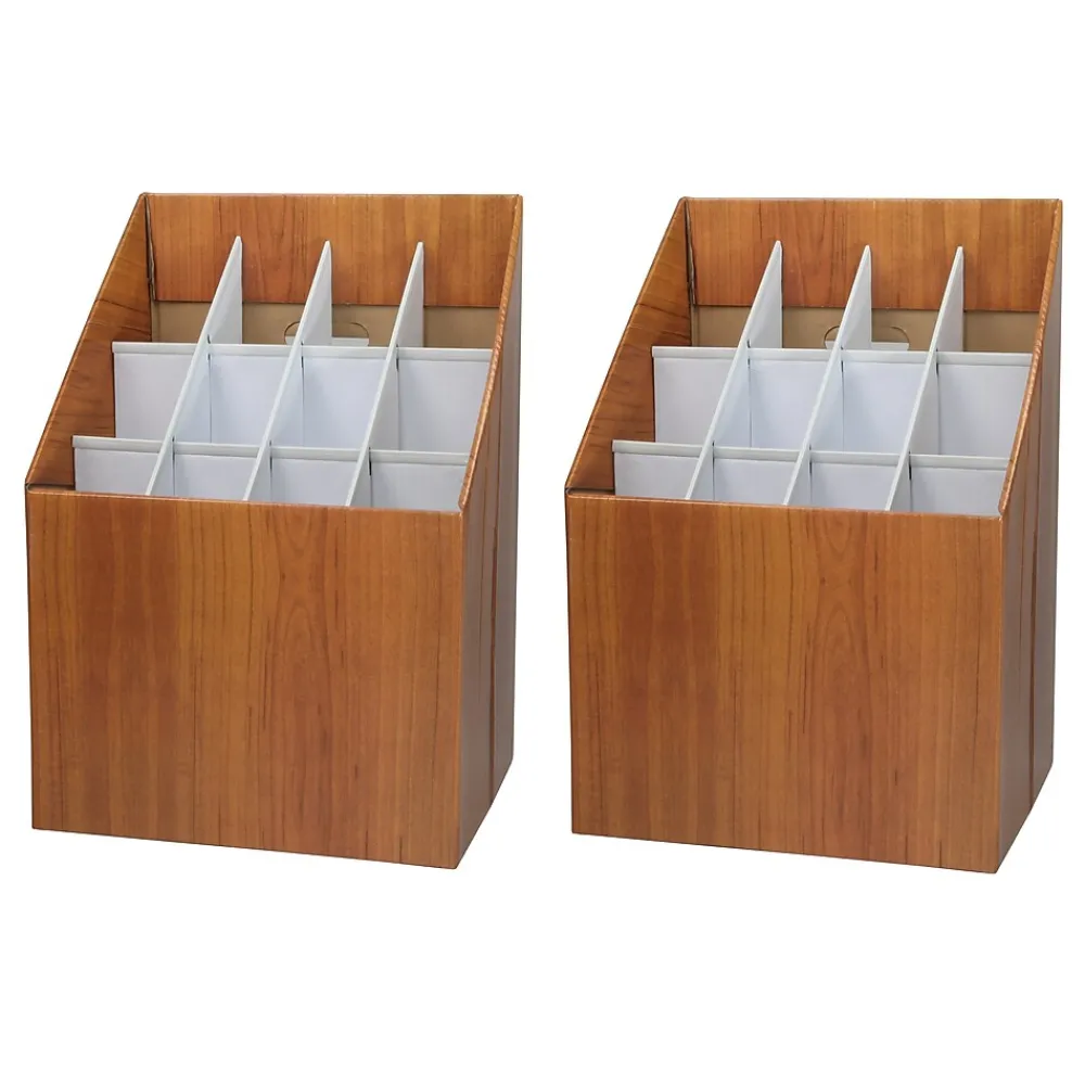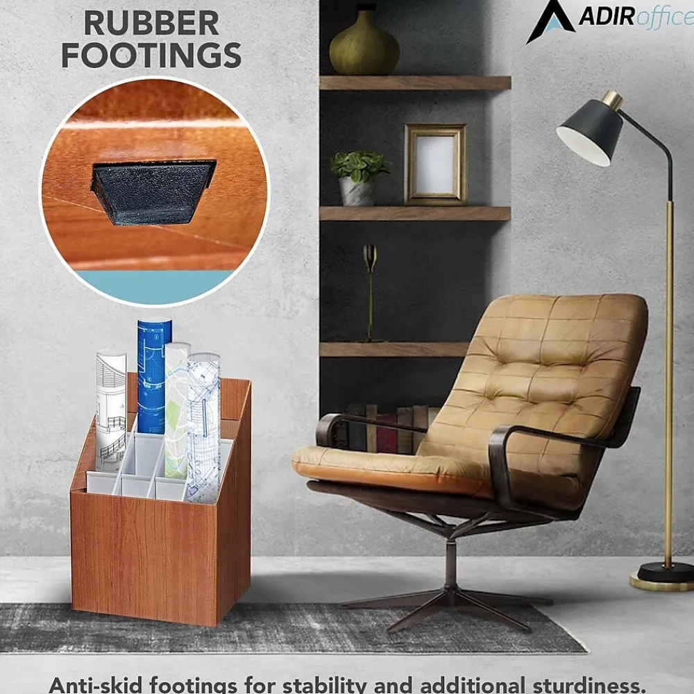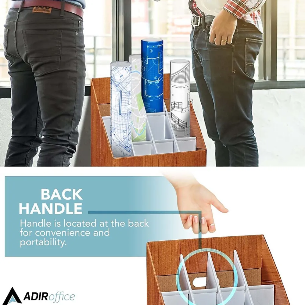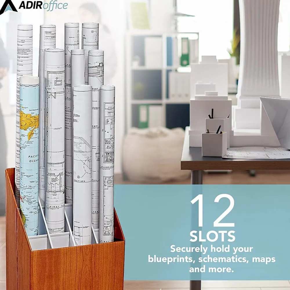 The AdirOffice upright roll file provides lightweight and economical upright storage for blueprints, plans, and maps. The compact upright roll file box can squeeze in anywhere. Features 12 compartments measuring 3″ across. The compartments are reinforced along the sides and tops with plastic molding to prevent rips and snags. Made of durable corrugated fiberboard in a walnut wood-grain finish. Set of two.