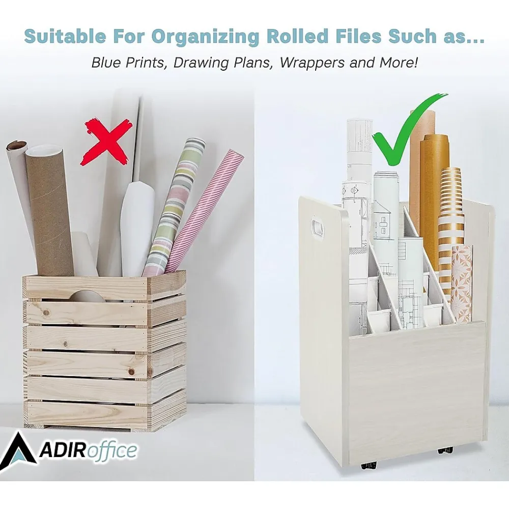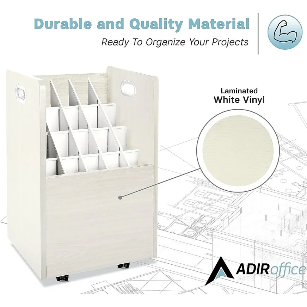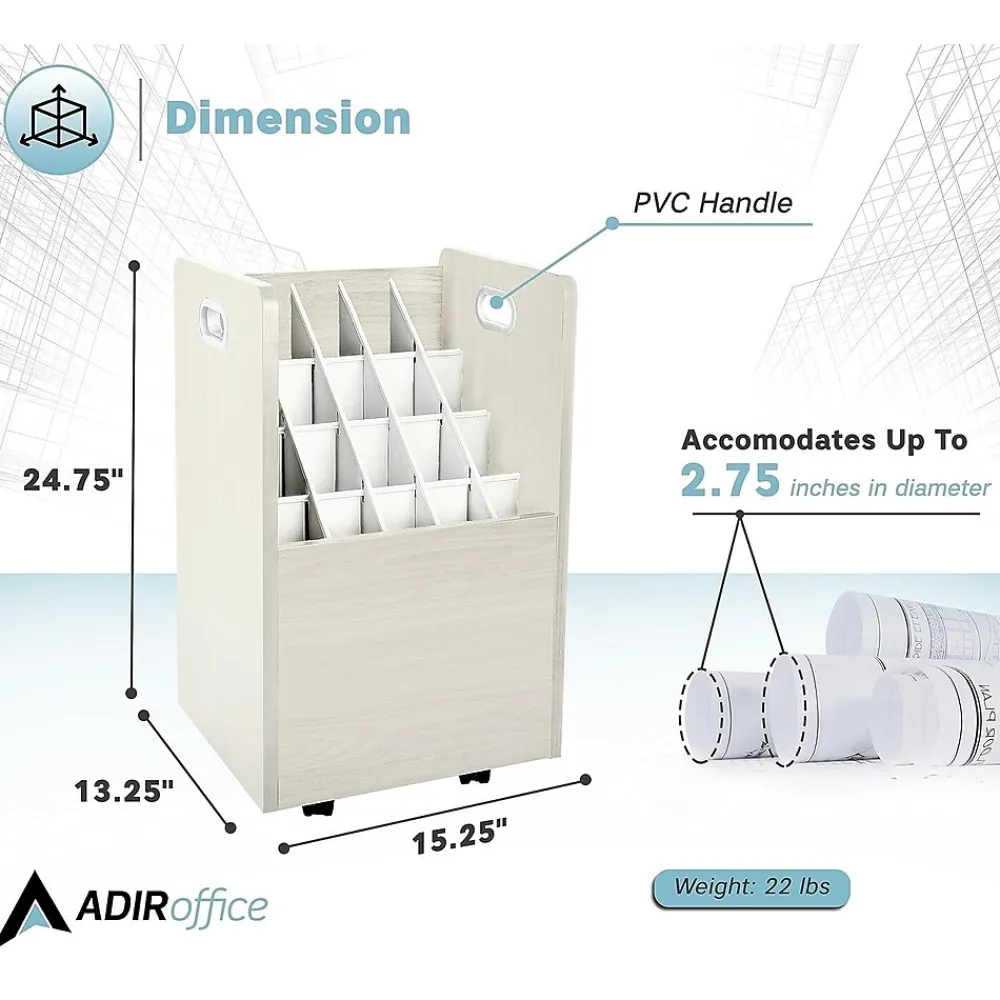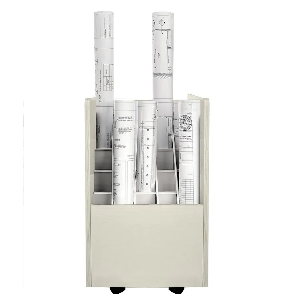 No matter how elaborate your current work-in-process is, there’s an efficient storage solution for keeping it organized. The AdirOffice Mobile Wood Blueprint Roll File holds your rolled blueprints, plan drawings, maps and other large-format documents snugly in square compartments, making it the perfect organizational solution. Sturdy and visually appealing, the unit is expertly crafted using durable wood composite to provide long-lasting strength and use for many years to come. Its furnished in your white vinyl laminate that will seamlessly complement any existing decor and boasts a 50-pound weight capacity to hold all of your rolled files in one convenient place. The bottom of the cabinet is outfitted with four, swiveling casters to facilitate easy movement of your documents, while side handles make it easy to hold and transport the unit from one location to the next.