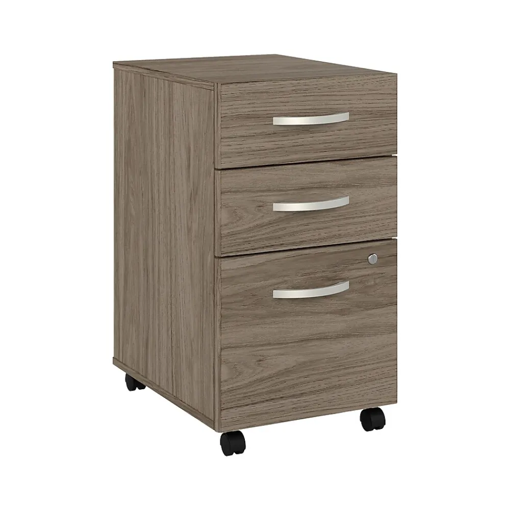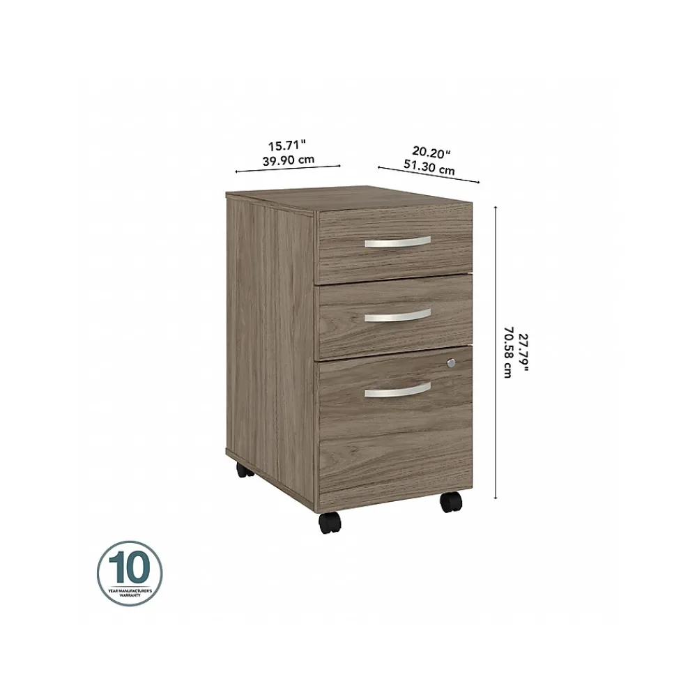 The Bush Business Furniture Studio C three-drawer mobile file cabinet rolls with you throughout your office or remains in place as needed on any surface. You’ll have your letter-, legal-, and A4-size paperwork organized in no time as the file cabinet ships fully assembled. Two box drawers hold your pens, notepads, and small office supplies. The file drawer opens on full-extension ball bearing slides, making it easy to reach papers at the back. Dual-wheeled, hooded casters keep the three-drawer cabinet moving on your floor or carpet. A single lock secures the bottom two drawers to protect sensitive paperwork and personal items. Eye-catching brushed nickel drawer pulls complement the beautiful finish. The mobile file cabinet comes with a 10-year manufacturer warranty and meets ANSI/BIFMA quality test standards. American-made with US and imported parts.