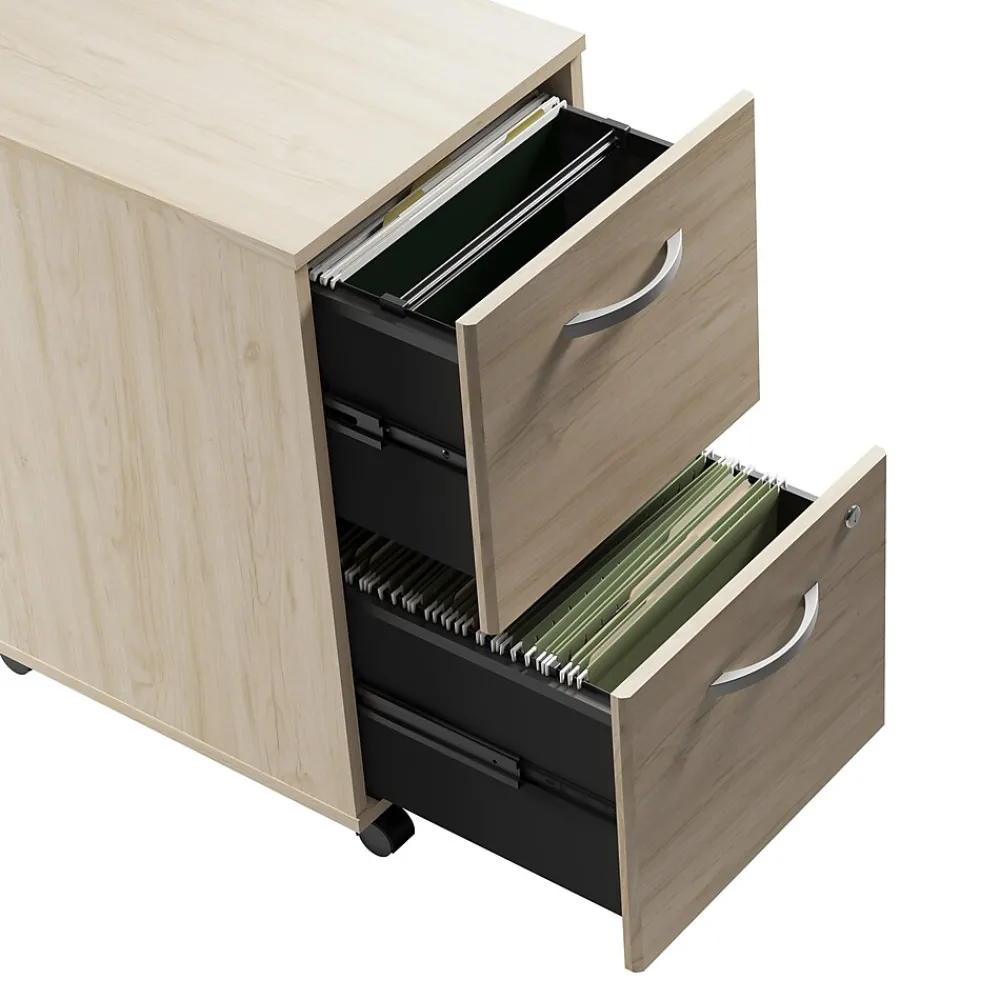 The Bush Business Furniture Studio C 2 Drawer Mobile File Cabinet rolls with you throughout your office or remains in place as needed on any surface. You’ll have your letter, legal and A4-size paperwork organized in no time as the Mobile File Cabinet ships fully assembled. Both drawers open on full-extension ball bearing slides, making it easy to reach files at the back. Dual-wheeled, hooded casters keep the cabinet moving on your office floor or carpet and a lock secures both drawers to keep paperwork private. Eye-catching Brushed Nickel drawer pulls complement your choice of several contemporary or traditional finishes to make the cabinet as attractive as it is functional. The Mobile File Cabinet comes with a 10 Year Manufacturer’s Warranty and meets ANSI/BIFMA test standards. See the full collection for coordinating items available. American made with U.S. and imported parts.