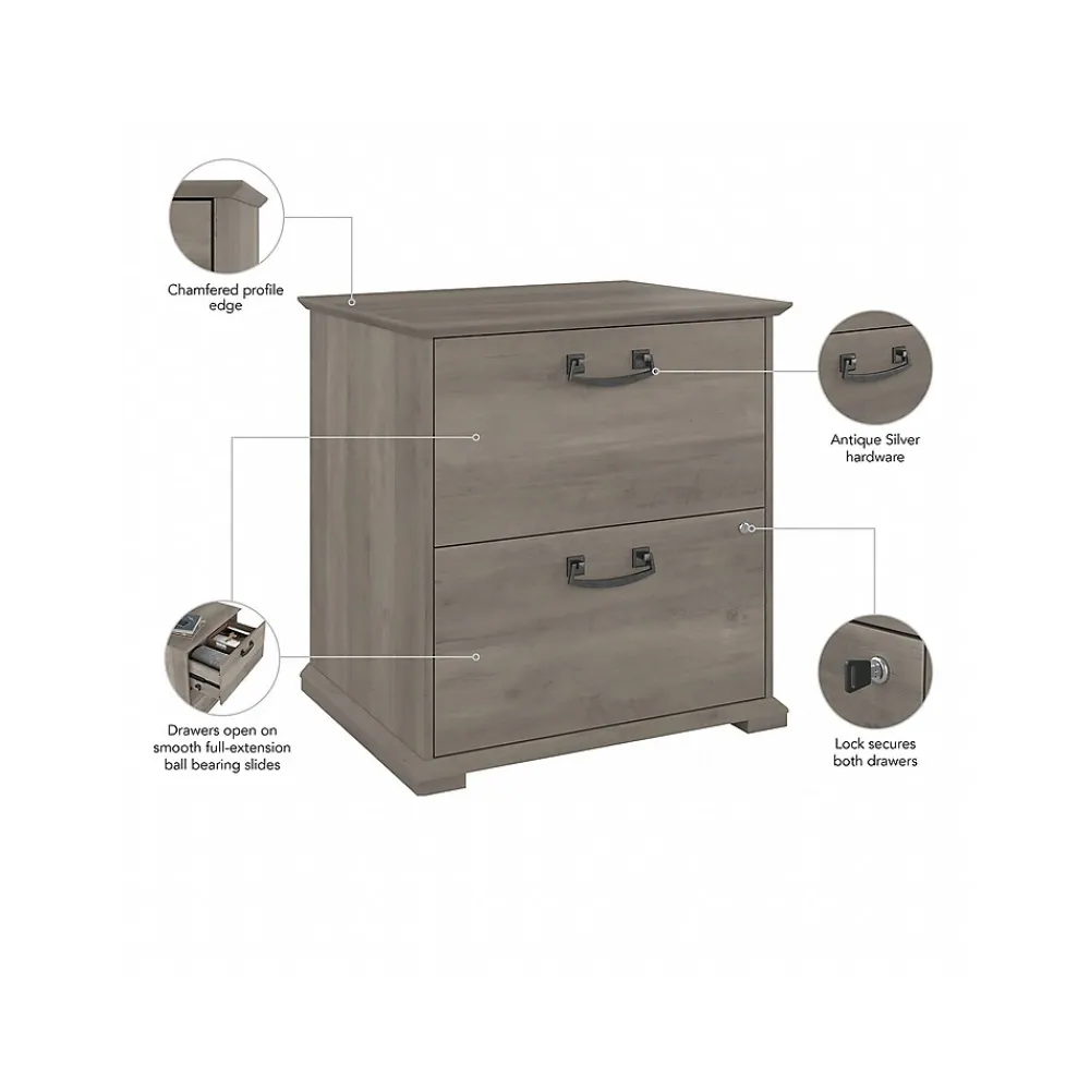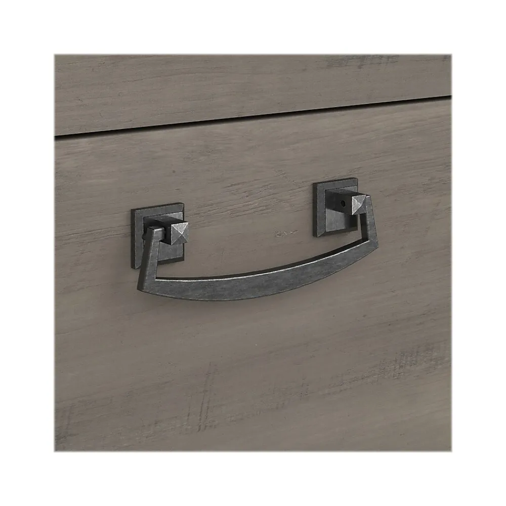 The Bush Furniture Homestead farmhouse-style lateral file cabinet offers a practical storage solution with an appealing modern farmhouse style. This filing cabinet utilizes Tip Guard safety features that include a stable design, a counterweighted back panel, wall attachment hardware, and safe-open drawers. Locking file cabinet’s drawers pull out one at a time for safe use and each support up to 50 lbs. Full-extension ball bearing slides provide easy-reach access to the letter-, legal-, and A4-size paperwork. A single lock secures both drawers for your privacy. Decorative trestle patterns, chamfered profile edges, and antique silver hardware give this cabinet a casual farmhouse style. This file cabinet has been tested to meet the ANSI/SOHO quality standards for safety and performance and is backed by a 1-year limited warranty. See the complete Homestead collection for more items.