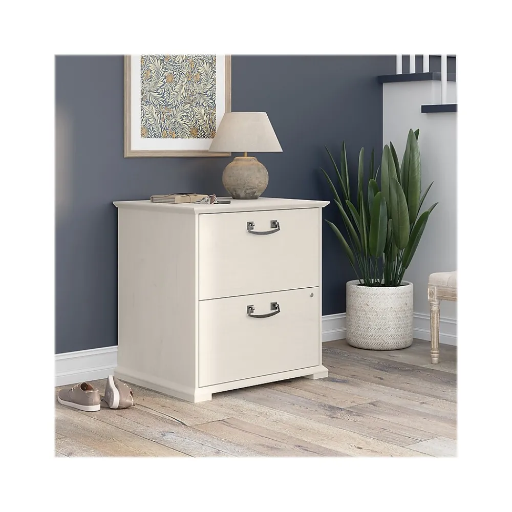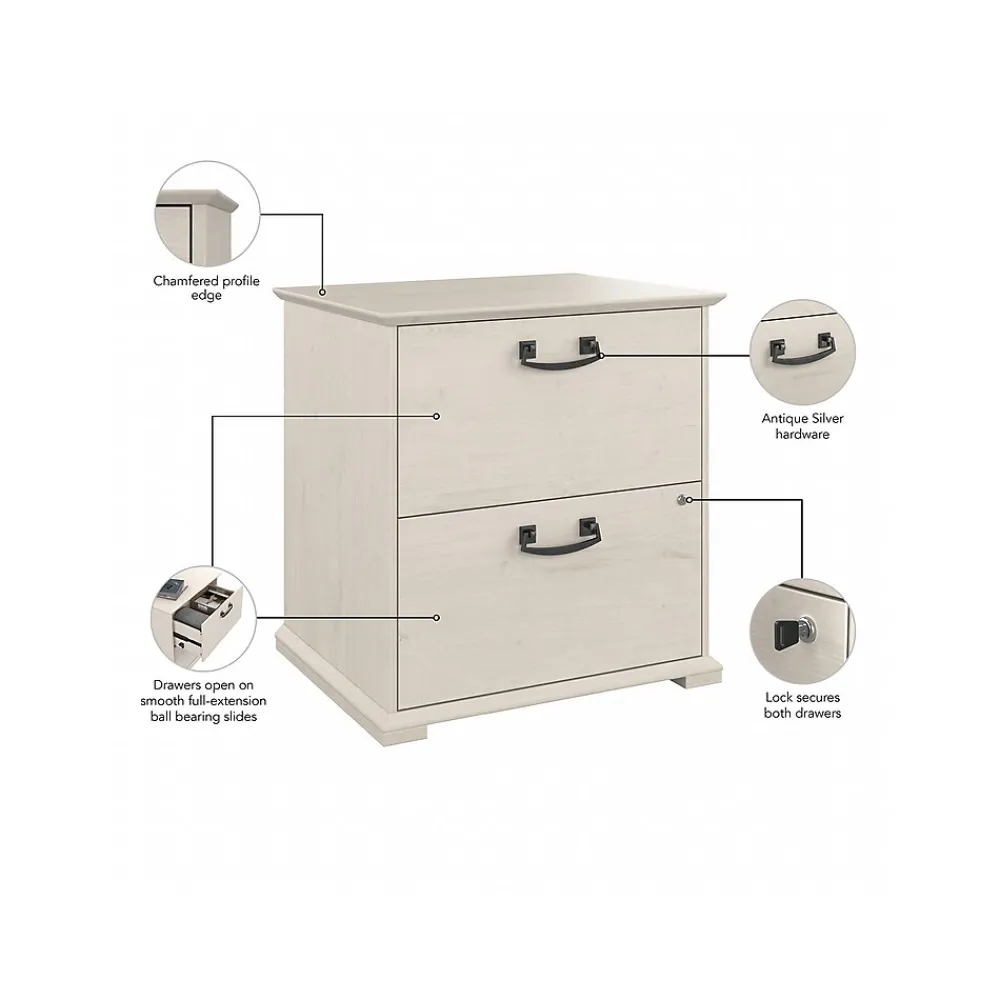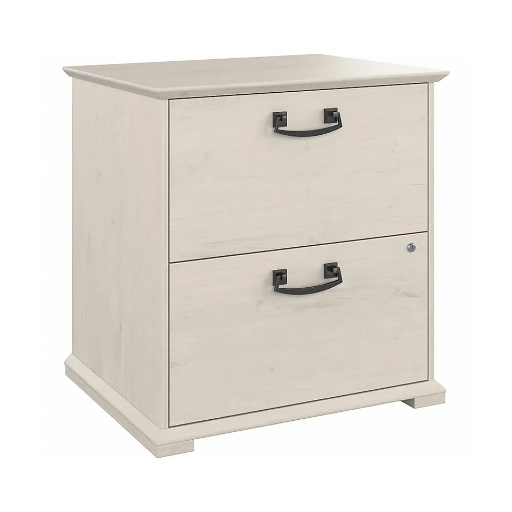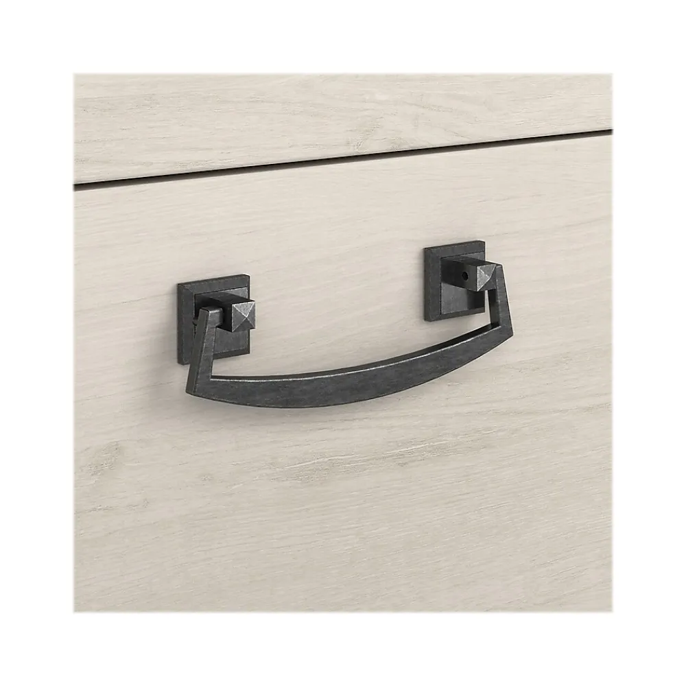 The Bush Furniture Homestead farmhouse-style lateral file cabinet offers a practical storage solution with an appealing modern farmhouse style. This filing cabinet utilizes Tip Guard safety features that include a stable design, a counterweighted back panel, wall attachment hardware, and safe-open drawers. Locking file cabinet’s drawers pull out one at a time for safe use and each support up to 50 lbs. Full-extension ball bearing slides provide easy-reach access to the letter-, legal-, and A4-size paperwork. A single lock secures both drawers for your privacy. Decorative trestle patterns, chamfered profile edges, and antique silver hardware give this cabinet a casual farmhouse style. This file cabinet has been tested to meet the ANSI/SOHO quality standards for safety and performance and is backed by a 1-year limited warranty. See the complete Homestead collection for more items.