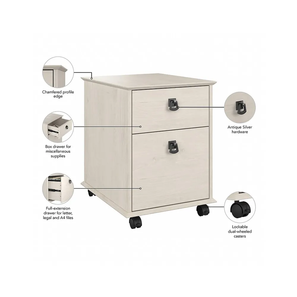 The Bush Furniture Homestead Farmhouse Mobile File Cabinet offers a practical storage solution with appealing modern farmhouse style. The filing cabinet rolls on lockable dual-wheeled casters wherever you need it. The convenient file drawer accepts letter and A4-size documents and opens on smooth full-extension ball bearing slide. Take advantage of the box drawer to store small supplies such as pens, notebooks, and more. The portable filing cabinet’s lockable dual-wheeled casters provide effortless mobility so you can enjoy convenient storage anywhere in your home office, and the low-profile design fits underneath Homestead’s 48W Farmhouse Writing Desk and 60W Farmhouse L Shaped Desk for a space-saving configuration. Decorative trestle patterns, chamfered profile edges and Antique Silver hardware give this cabinet a casual farmhouse style and the Storage Cabinet’s back is fully laminated to look great facing any direction. Finishes with a beautiful natural grain pattern create a relaxed feel in your home or office. This file cabinet has been tested to meet ANSI/SOHO quality standards for safety and performance and is backed by the Bush Furniture 1 Year Manufacturer’s Warranty. See the complete Homestead Collection for coordinating items available.