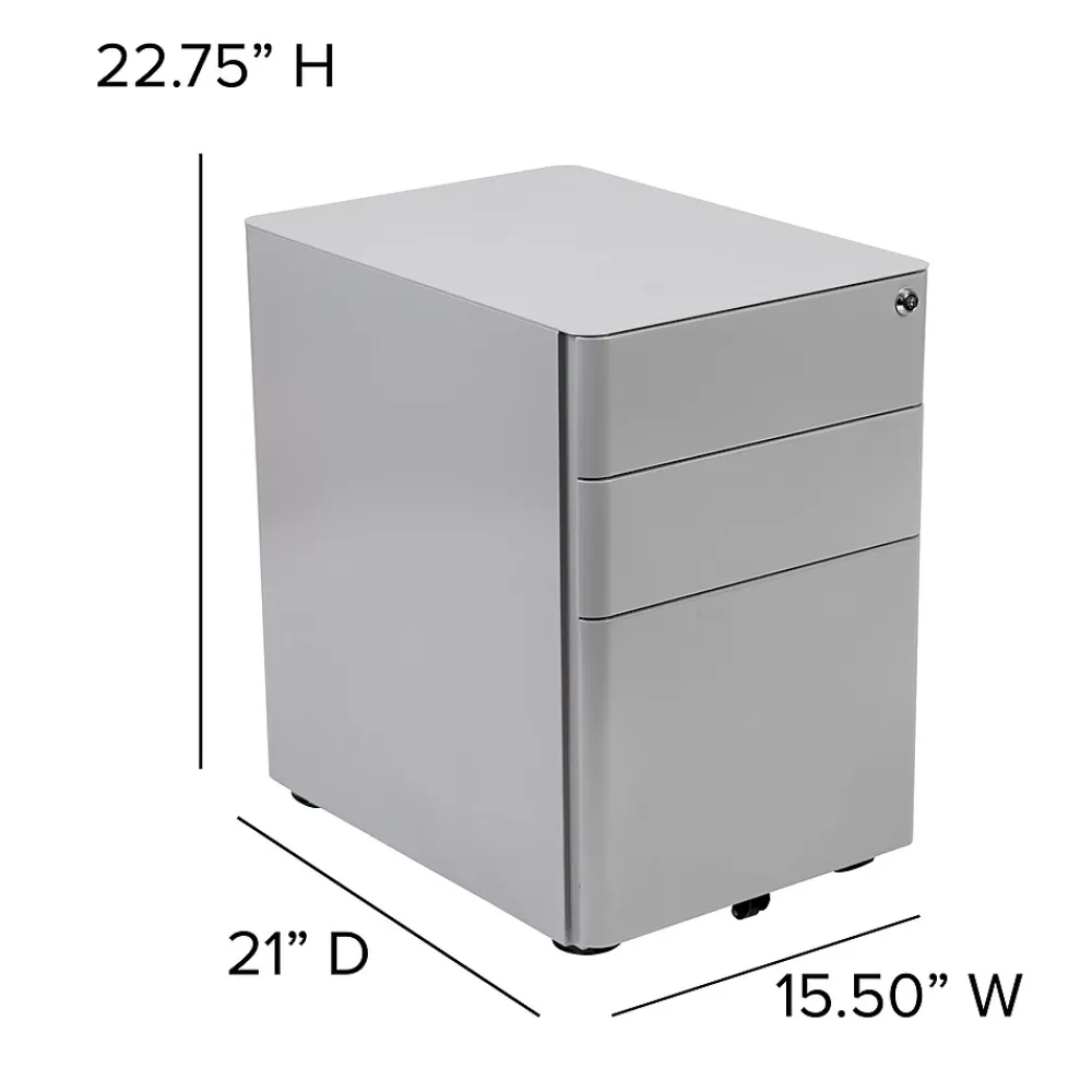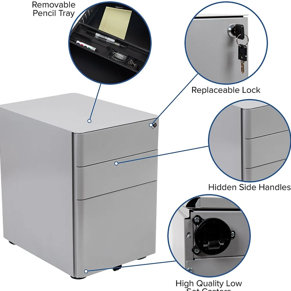You may love your desk but have nowhere to store your paperwork without cluttering the desktop, insert this locking file cabinet to keep the minimalistic appearance of your modern office desk. Ideal for employees who regularly file, the cabinet can be pulled near while monitoring incoming emails. The modern 3-drawer mobile file cabinet with low set casters has two utility drawers to hold your small office supplies, snacks, and writing utensils while the hanging file drawer holds letter, legal, A4 and F4 hanging folders. An included pencil tray keeps your small supplies neatly stored. Two keys are included to keep in separate locations or as a duplicate for your assistant. Smooth surfaced drawers offer clean sightlines and provide a worry-free solution to loosening handle screws over time. Organize your office space with this mobile under desk filing cabinet that comes fully assembled and ready-to-use.