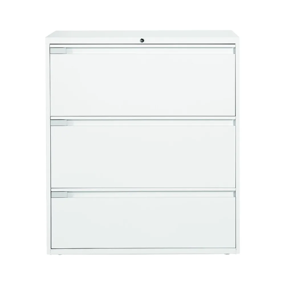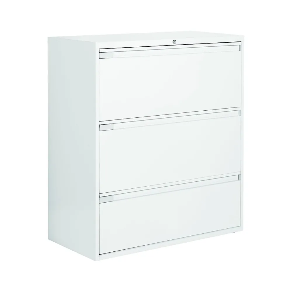 - Three-drawer lateral filing cabinet holds letter or legal-size documents