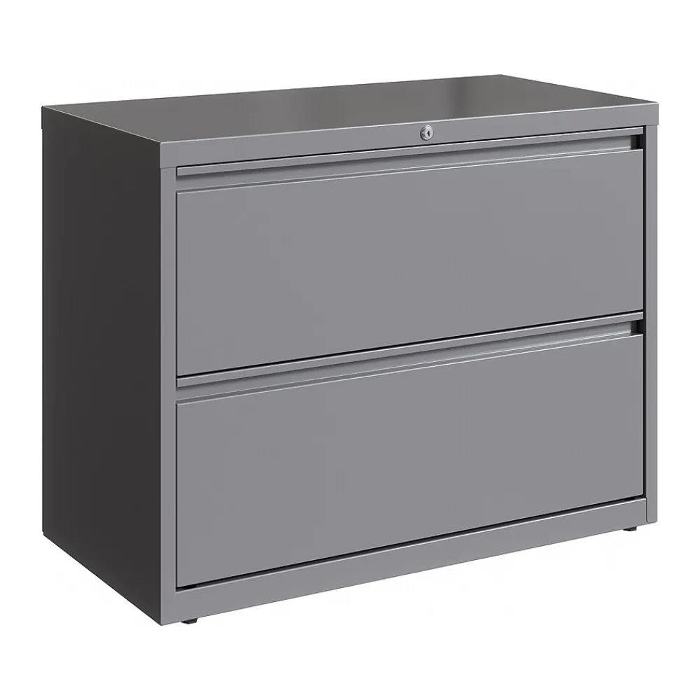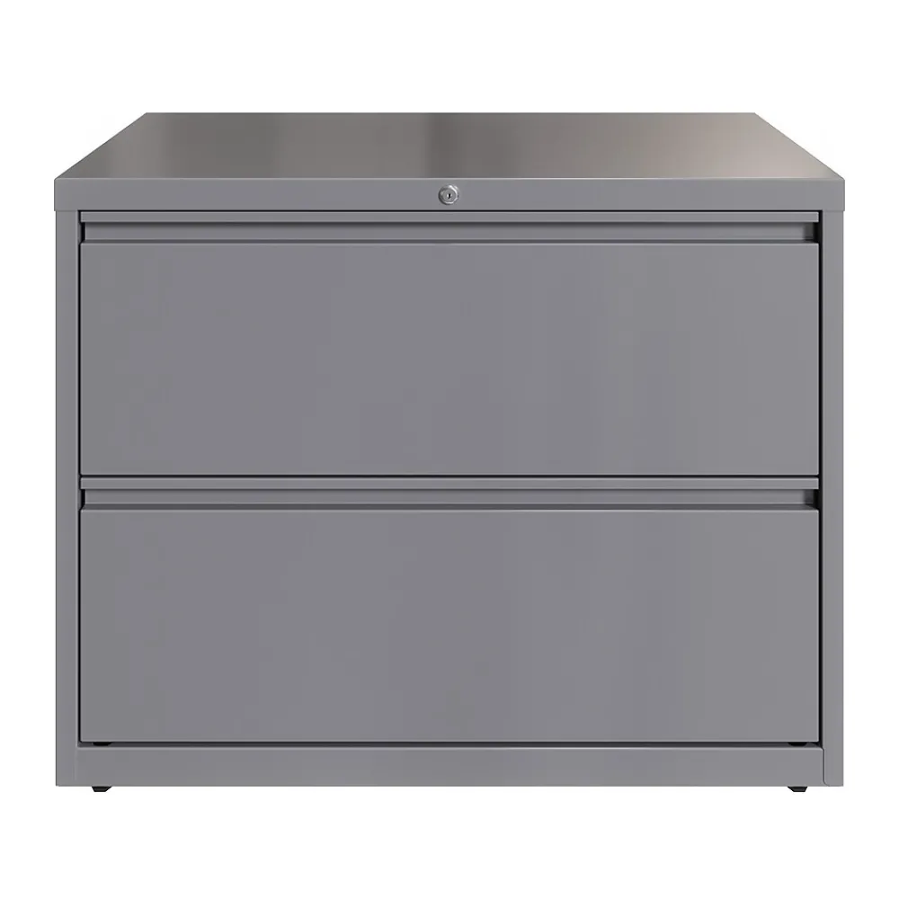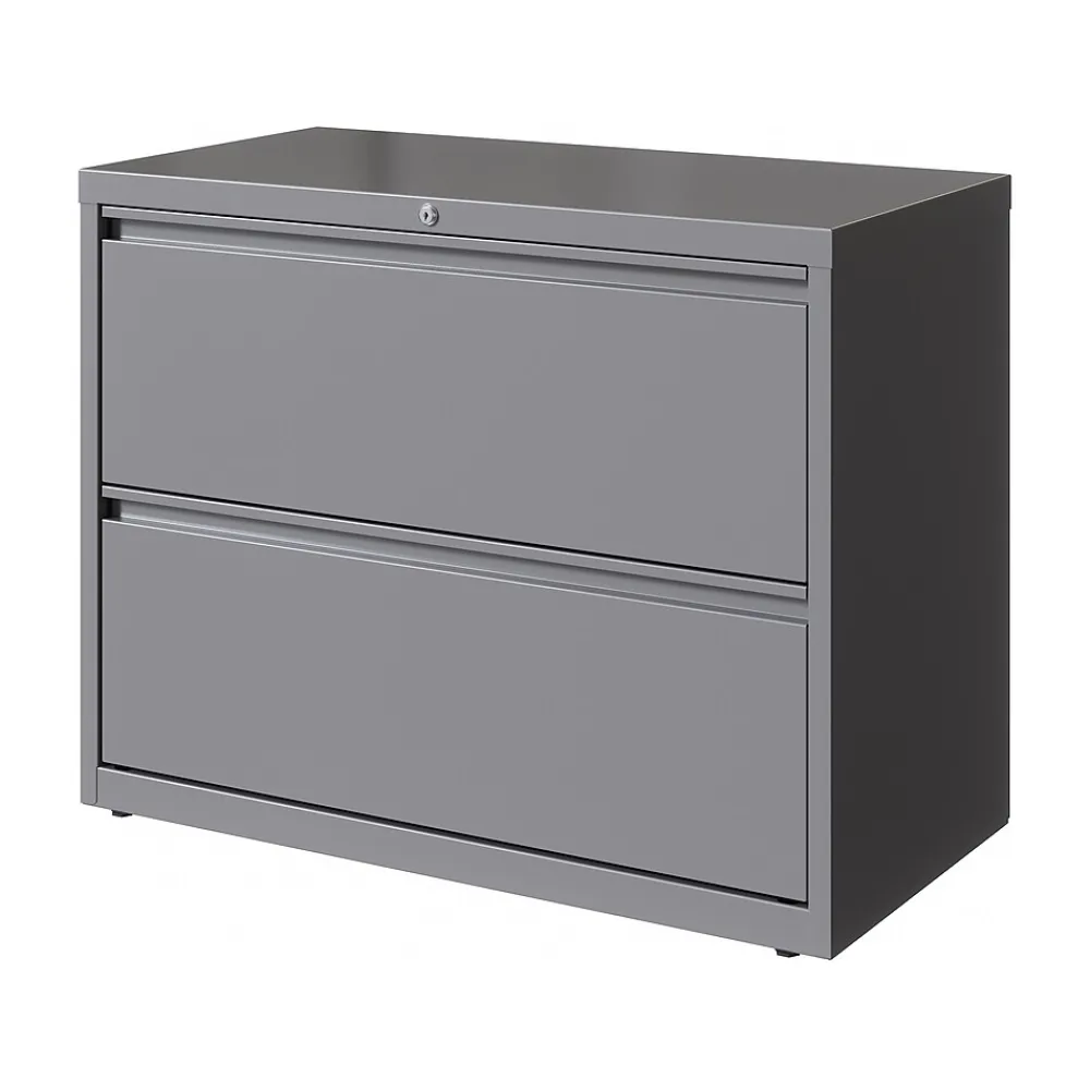 - Two-drawer lateral file cabinet holds letter-, legal-, or A4-size documents