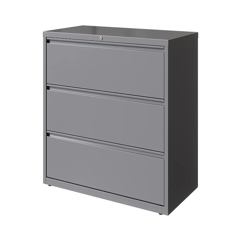 - Three-drawer lateral file cabinet holds letter-, legal-, or A4 size documents