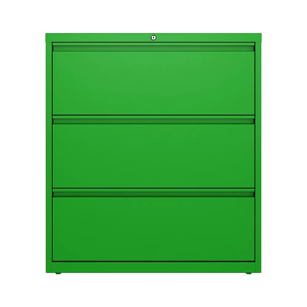 - Three-drawer lateral file cabinet holds letter-, legal-, or A4 size documents