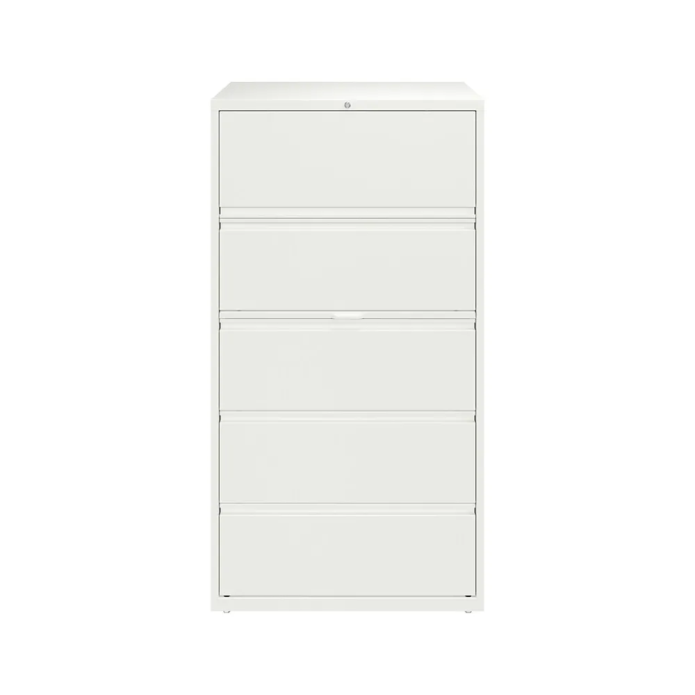 - Five-drawer lateral file cabinet holds letter-, legal-, or A4-size documents