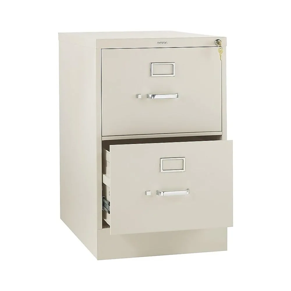 Get legal-size and other documents well-organized in this two-drawer filing cabinet. Built-in label holders let you easily identify stored records, and a tilt and slide follower block in each drawer keeps files upright and neat. This HON 310 series vertical file cabinet has thumb latches and a replaceable lock for secure closure, and the steel ball bearing suspension system lets the drawers glide smoothly.