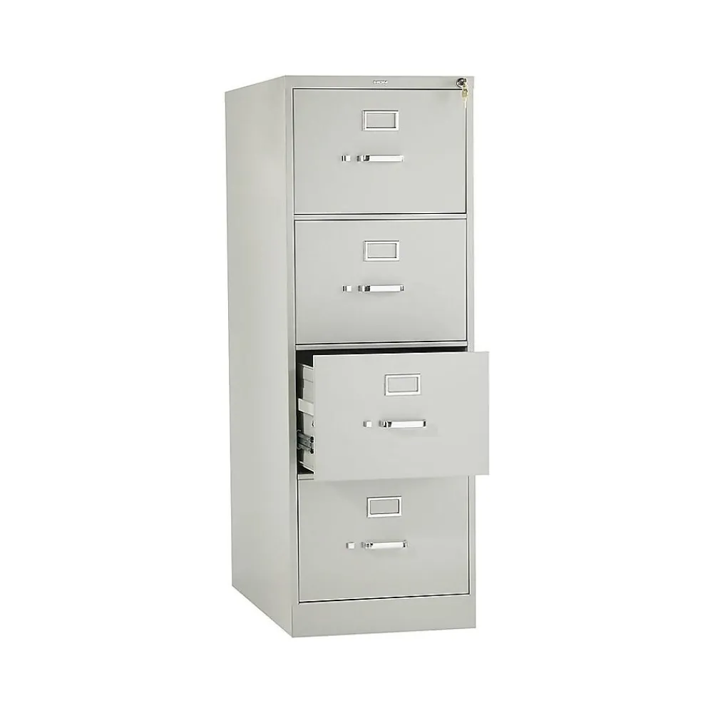 - Four-drawer vertical filing cabinet holds legal-size documents