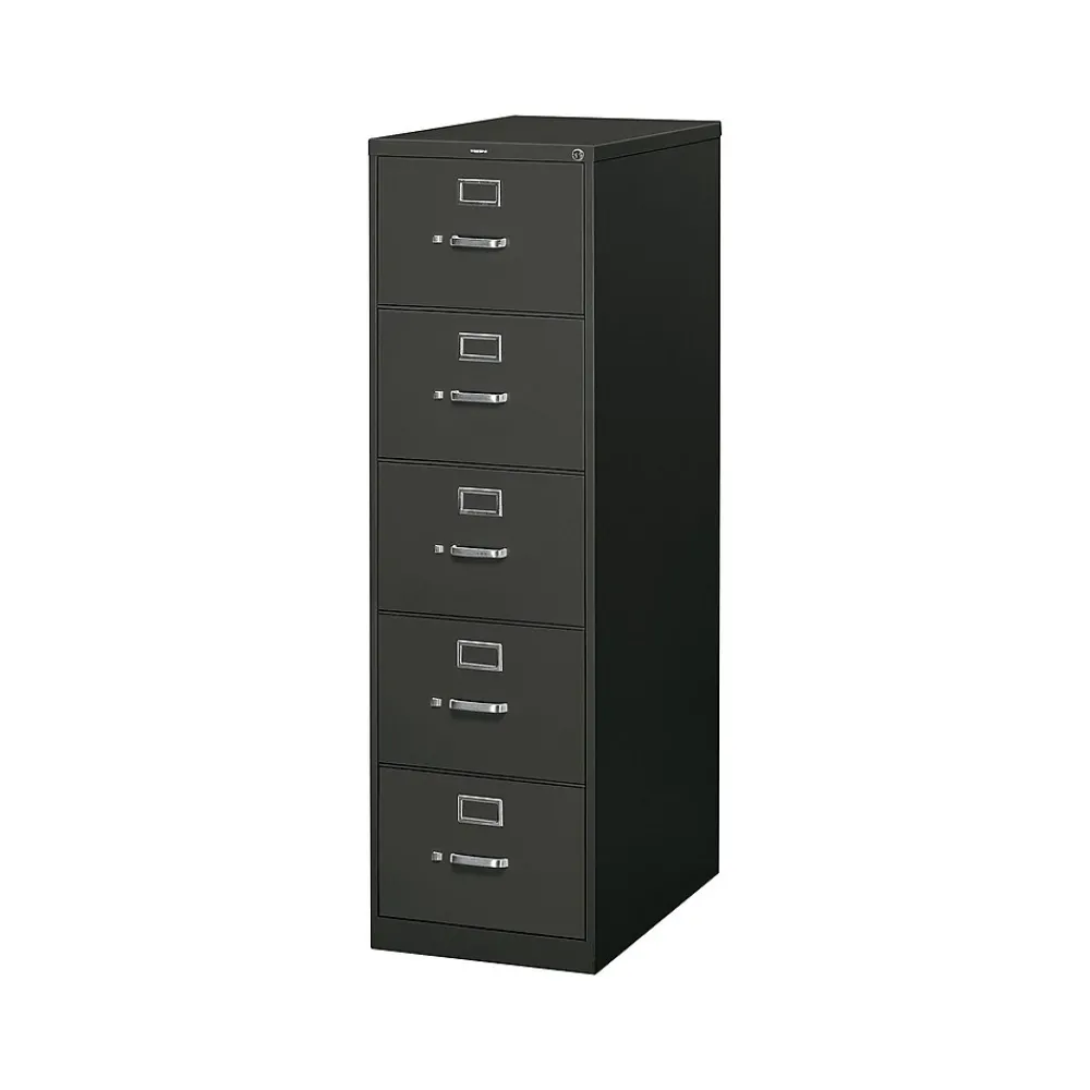 - Five-drawer vertical filing cabinet holds legal-size documents