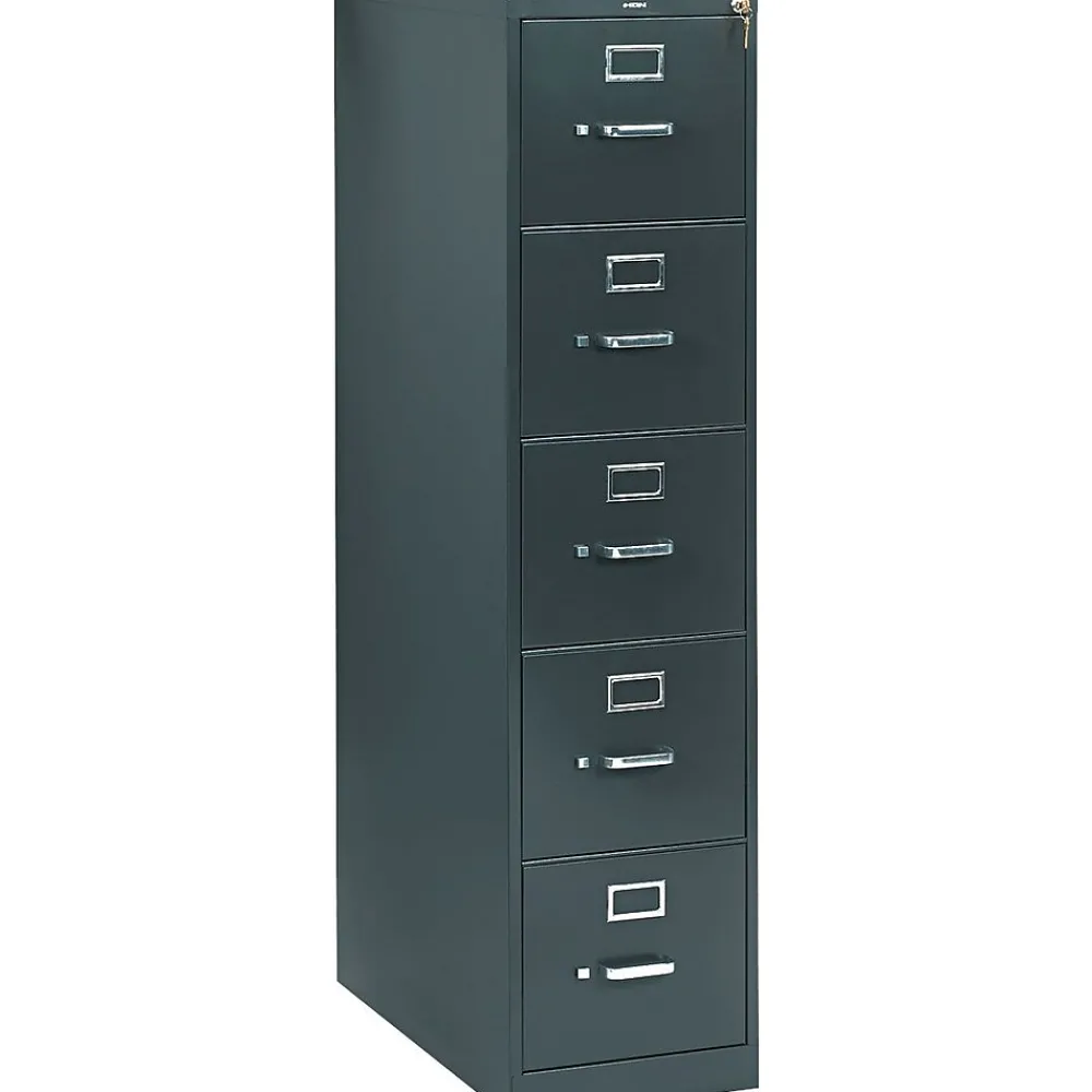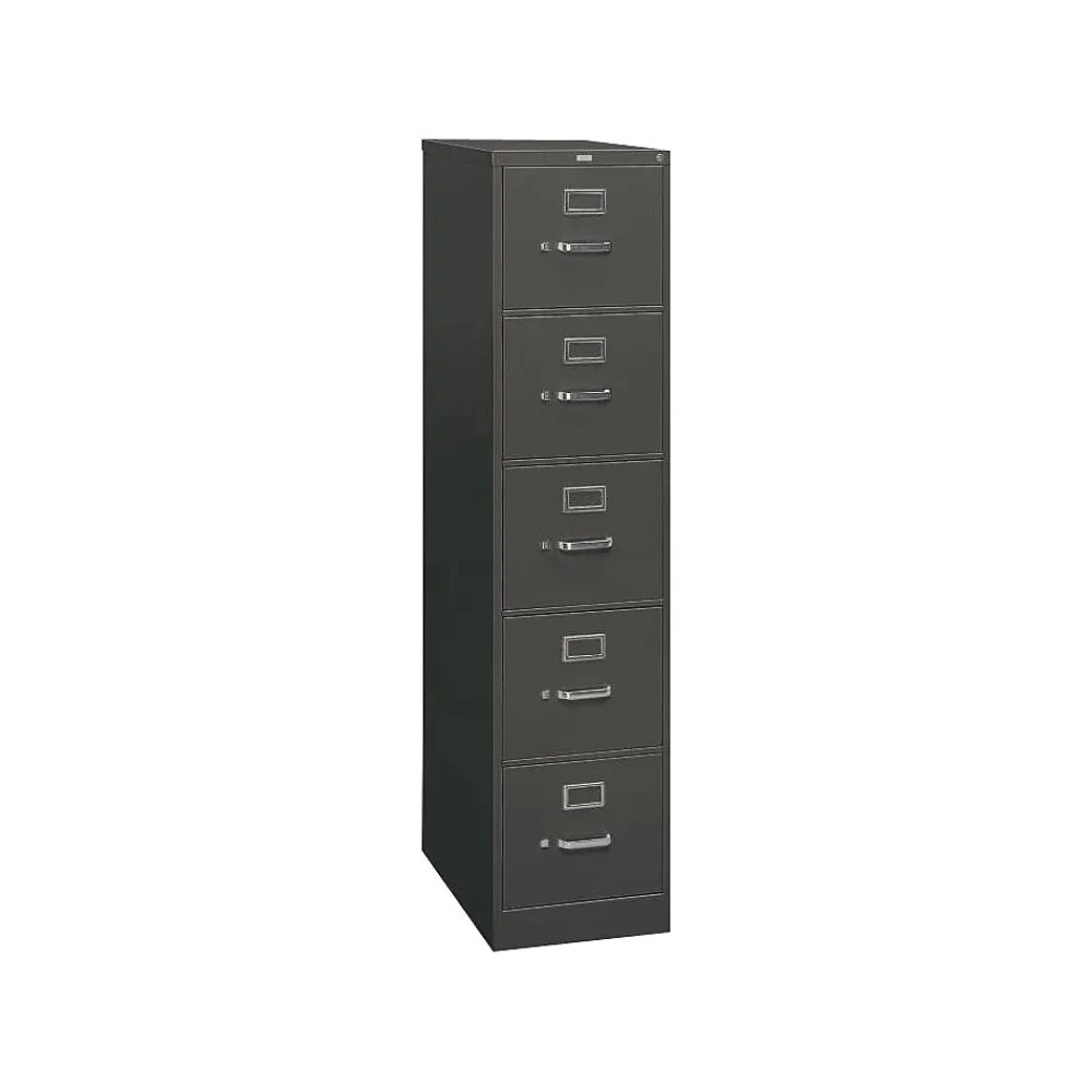 HON 310 Series vertical file cabinet in charcoal color measuring 60″ x 15″ x 26 1/2″ features five drawers to offer extra storage space for file folders.