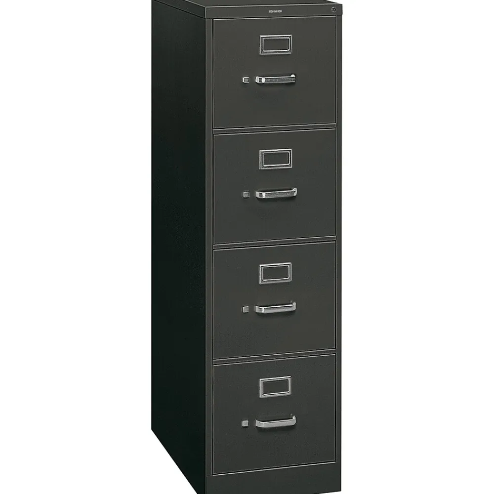 HON 310 Series vertical file cabinet in charcoal color features four drawers to offer extra storage space for file folders. Cabinet has a tilt and slide follower block in each drawer keeping files upright and neat.