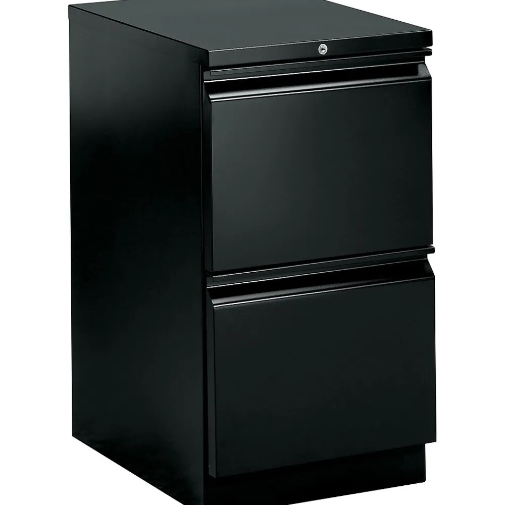 HONĀ® Brigade⢠2 Drawer mobile pedestal file in black color measures 28″ x 15″ x 19 7/8″ and ideal for letter-size files. Pedestal file features counterweight anti-tip mechanism with steel ball bearing suspension for easy sliding.