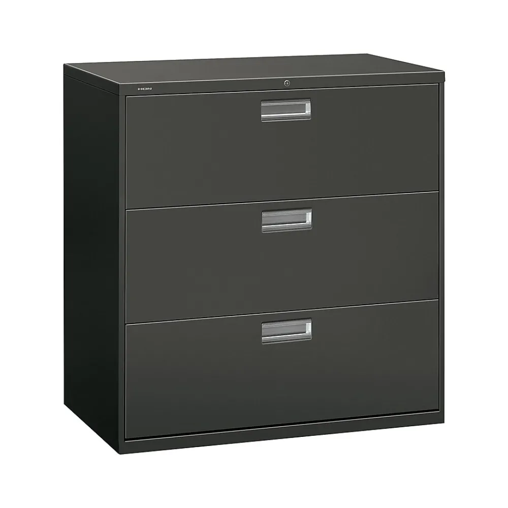- Three-drawer lateral filing cabinet holds letter- or legal-size documents
