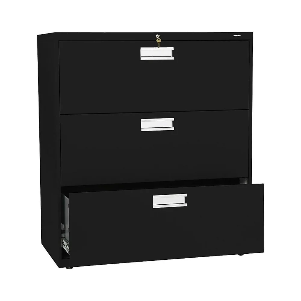 Give important files dedicated space in your office with this HON Brigade 600 series lateral file. A built-in counterweight prevents tipping when one of the three spacious drawers is opened, and a mechanical interlock prevents multiple drawers from opening at the same time. With a two-sided lock mechanism and removable lock core, this HON Brigade 600 series lateral file keeps sensitive documents securely tucked away.