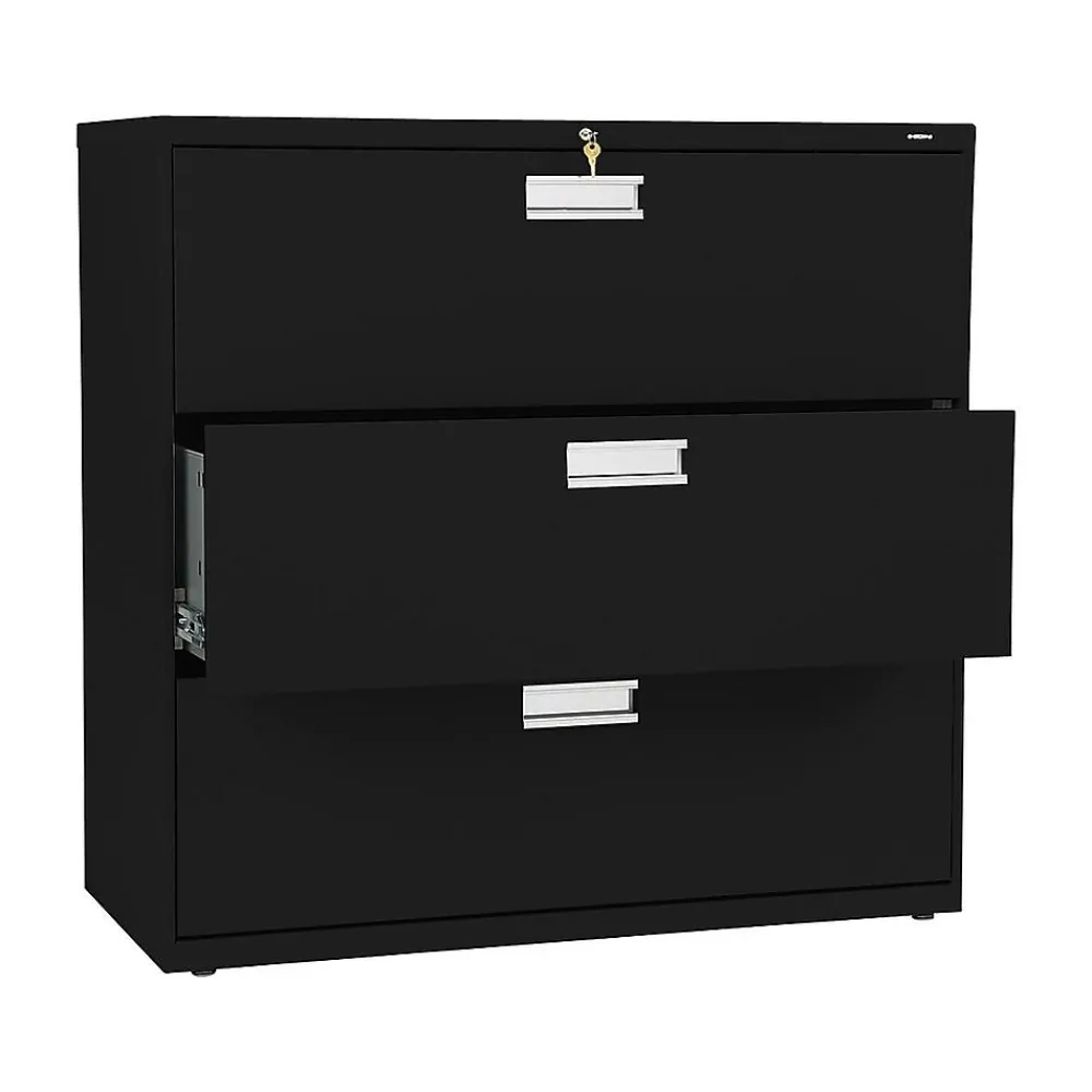 Keep paperwork organized with this HON 600 series three-drawer lateral file cabinet. Its durable steel frame can stand up to everyday use, and the three drawers operate smoothly and quietly thanks to ball bearing suspensions, while a mechanical interlock prevents multiple drawers from opening at the same time. With a two-sided lock mechanism and removable lock core, this HON Brigade 600 series lateral file keeps sensitive documents securely tucked away.