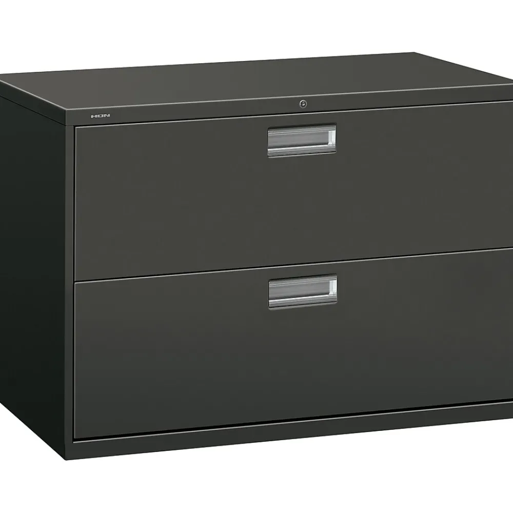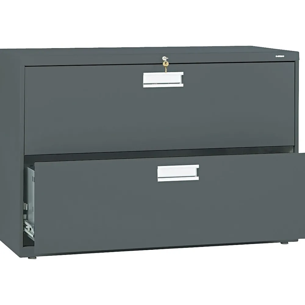 HONĀ® Brigade⢠600 Series Lateral file cabinet in charcoal color is constructed from 30 percent post consumer materials. Lateral file cabinet measuring 28 3/8″ x 42″ x 19 1/4″ features two drawers for storing the files up to 3.5 cu. ft.