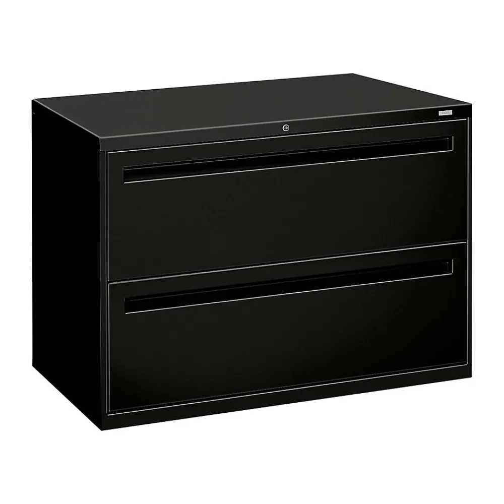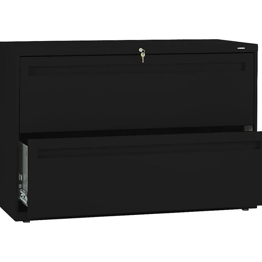 Keep important papers tidy and contained with this two-drawer lateral filing cabinet. Each 3.5 cubic foot drawer accommodates plenty of files, while the built-in counterweight and adjustable leveling glides ensure stability. The professional black finish lends sophistication to your office environment, and the full-width handles simplify drawer opening. This HON Brigade lateral file includes interchangeable-core removable locks to secure confidential papers.