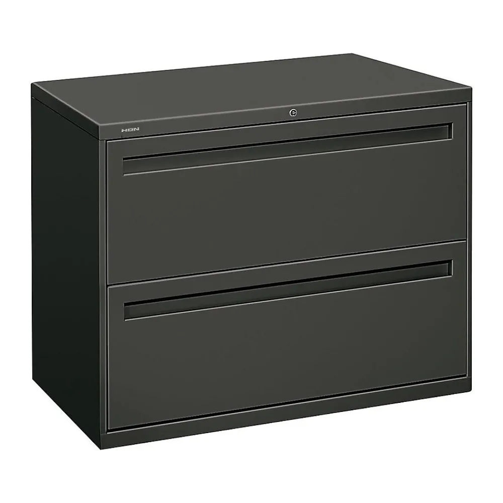 - Two-drawer lateral filing cabinet holds letter- or legal-size documents