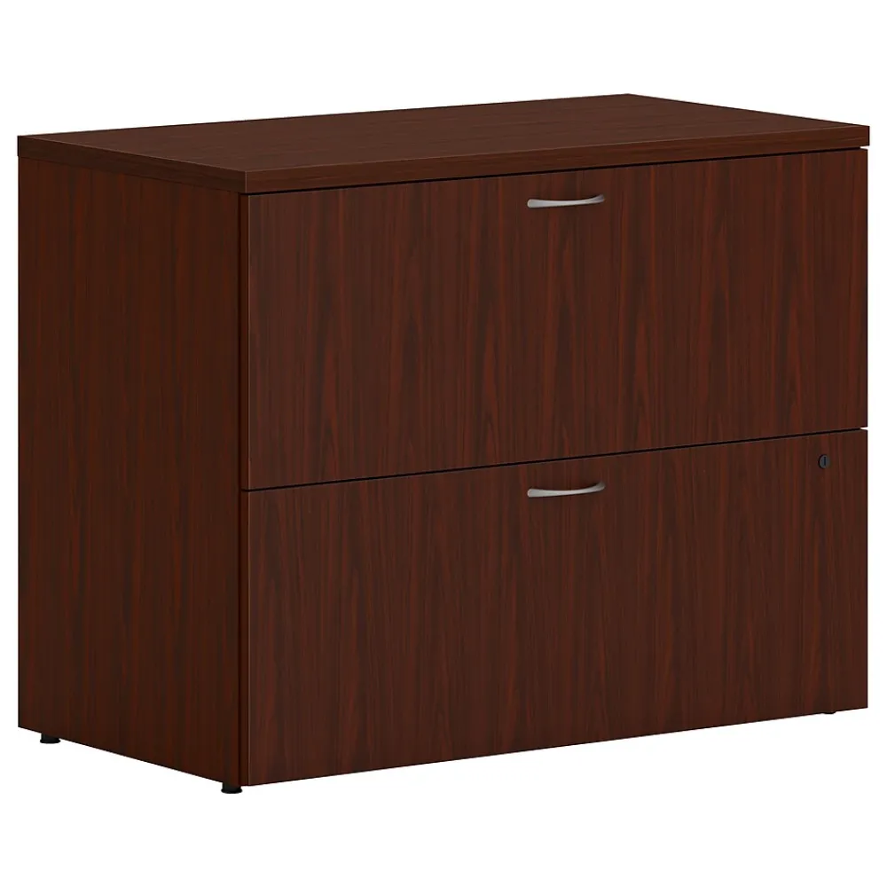 There is always beauty in simplicity, but with the HON Mod desk collection, you’ll also find variety and value. This 36″ two-drawer lateral file cabinet can stand alone, or the top can be removed to convert it to a support pedestal for a Mod desk or credenza shell. It increases the storage capacity of a workstation and features ball bearing drawer suspensions for quiet, smooth operation. Each drawer accepts letter or legal paperwork, as well as hanging folders. The durable laminate surface is available in a variety of attractive finish options, which allows you to match other Mod elements. It’s totally productive. Totally adaptable.