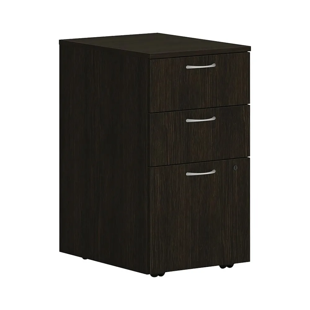 - Three-drawer mobile pedestal cabinet includes two box drawers for supplies and one file drawer for documents