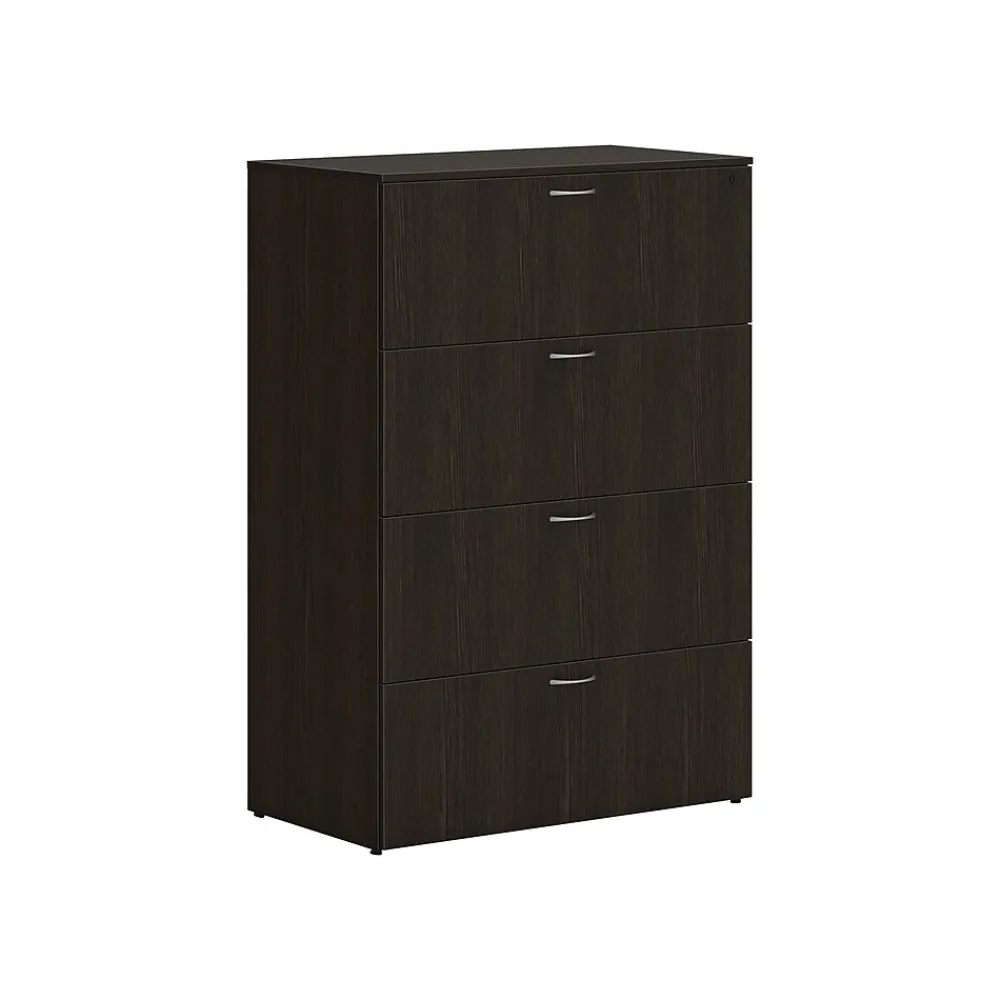 - Four-drawer lateral file cabinet holds letter- or legal-size documents