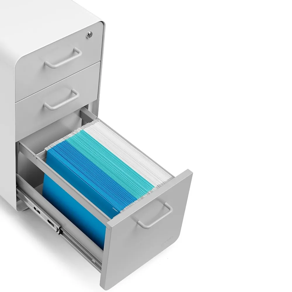 - Slim Stow File Cabinet with durable powder-coated steel construction stands up to movers and shakers