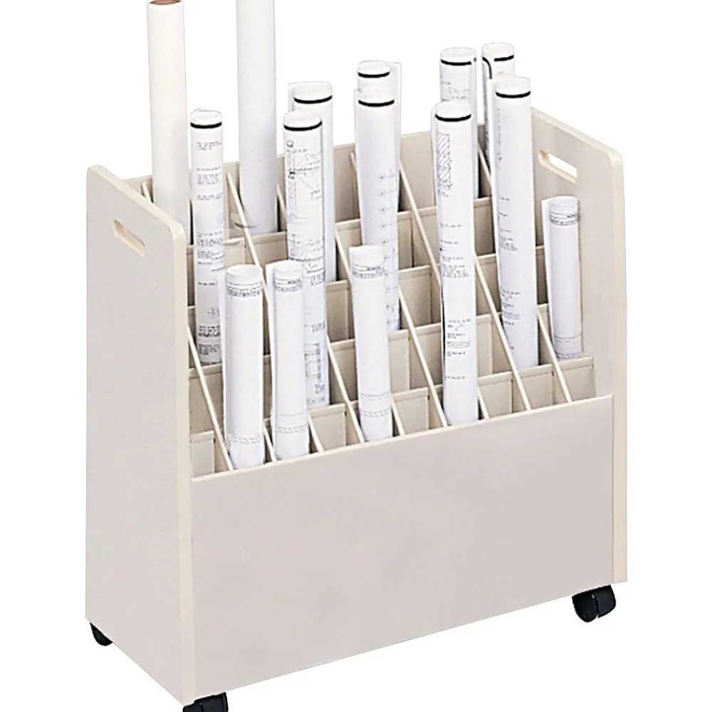 This Safco mobile roll file can hold multiple paper rolls of different lengths, so you can easily organize and categorize your office supplies and finished projects. Mounted on sturdy casters, this unit rolls smoothly from room to room, making roll storage and access more convenient. This file’s grandstand design makes it simple to view rolls and choose the size or type you need, and it includes 50 bins and two drawers so you can maximize office storage space.