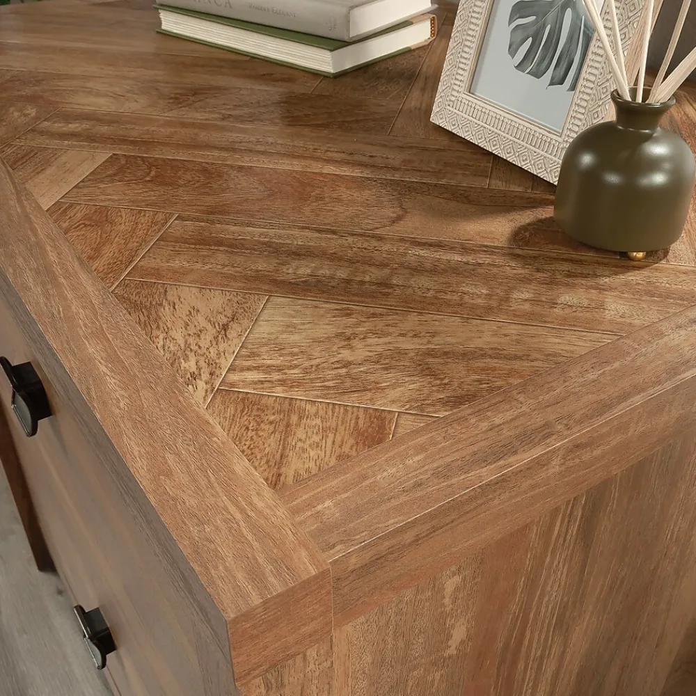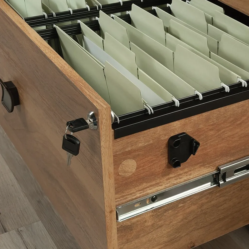 A lovely addition to your home office is just a click away with this lateral file from the Cannery Bridge collection. This 2-drawer lateral file cabinet features large drawers with full extension slides that hold letter or legal-size hanging files. Both drawers of this lateral filing cabinet lock for secure storage of your important documents. The interlocking safety mechanism allows only one drawer to open at a time for extra safety measures. The spacious top surface of this wood lateral file cabinet provides space to store and display items like a wireless speaker, stacks of magazines, decorative plants, and photos of your family and friends. A herringbone pattern detail on the top surface creates a visually stunning centerpiece to any room. This legal-size filing cabinet is finished on all sides, so it will look polished from every angle. Finished in Sindoori Mango and detailed with attractive hardware, this 2-drawer file cabinet is the storage solution your home needs.