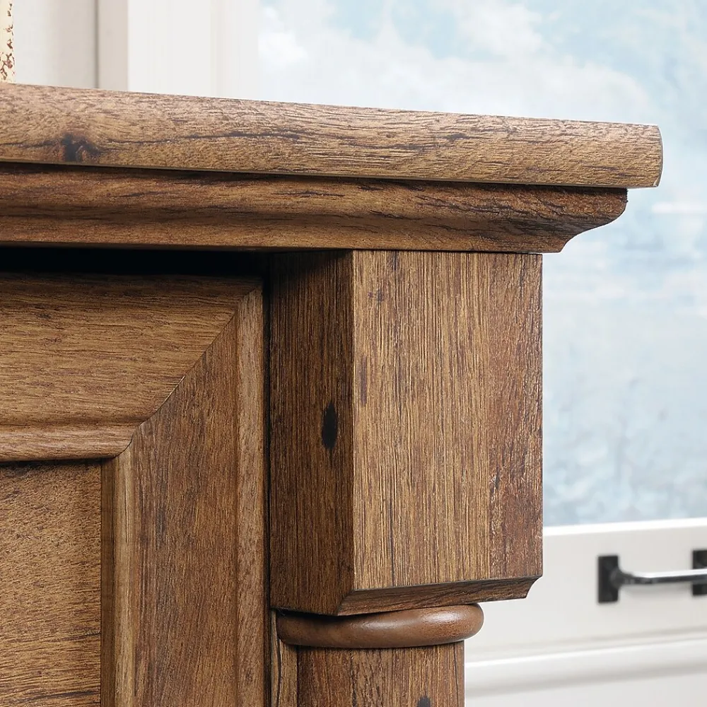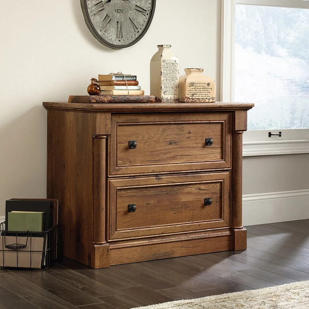 Elegant style and organizationthat is what you will get with this lateral file from the Palladia collection. This handsome file cabinet features two drawers that open and close on smooth full extension slides. Each drawer accommodates letter, legal or European size hanging files to keep you organized and clutter free. It features a patented, interlocking safety mechanism that allows only one drawer to open at a time for increased safety. Its spacious tabletop surface makes the perfect spot to display all your favorite thingsa stylish accent lamp, awards and achievements, decorative plants or any other home decor. Use it in your office, living room, or around the home as an accent pieceit looks good no matter where it stands! Finished in a beautiful Vintage Oak, this stunning lateral file gives your home the style you have been craving with the functionality you have needed.
