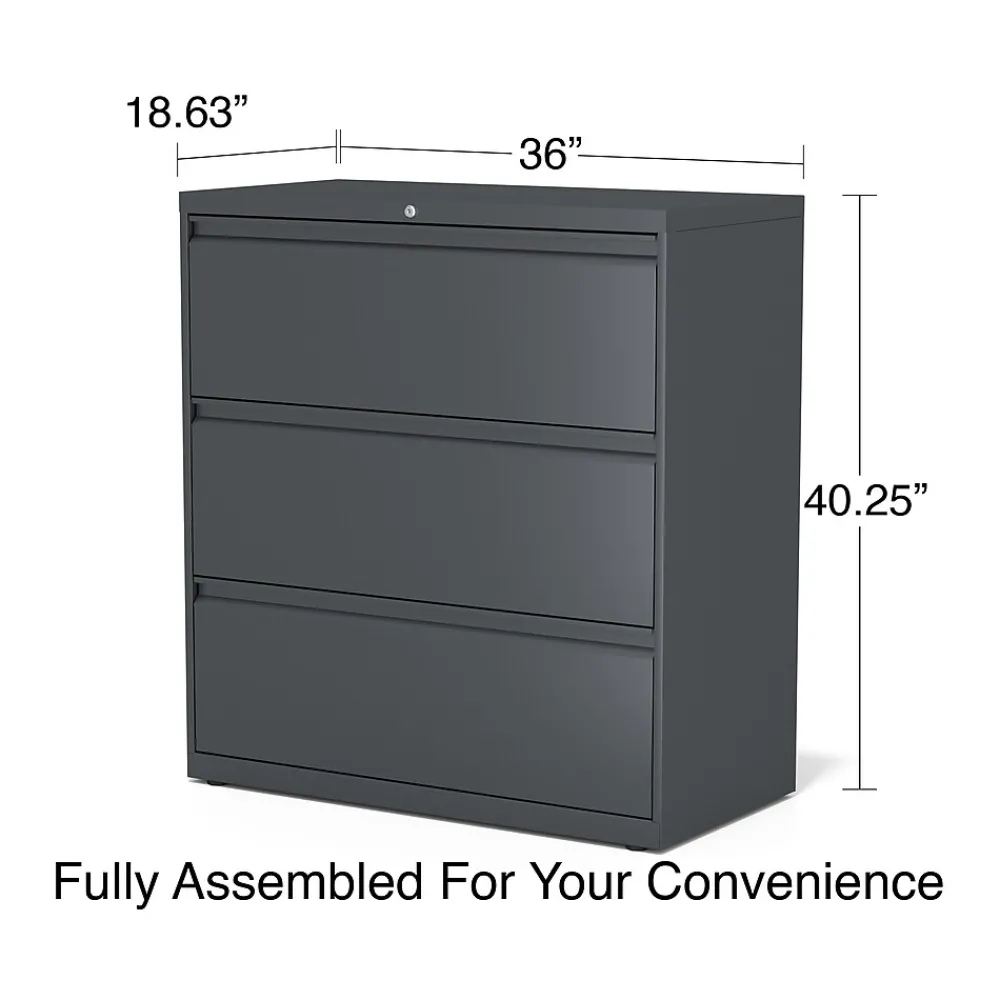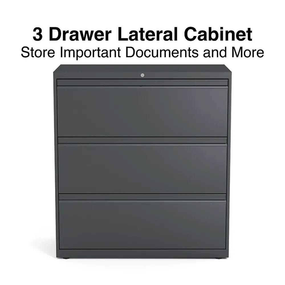 Get a durable, space-efficient solution to record storage with this three-drawer lateral file cabinet. Featuring a compact design, this cabinet fits easily in workplaces of all sizes and has a fine black finish and a sleek appearance that blends well with existing decor. The three 36-inch-wide drawers offer ample space for letter and legal-size hanging folders, ideal for document storage and recordkeeping. This lateral file cabinet lets you manage access to stored materials with a built-in lock.