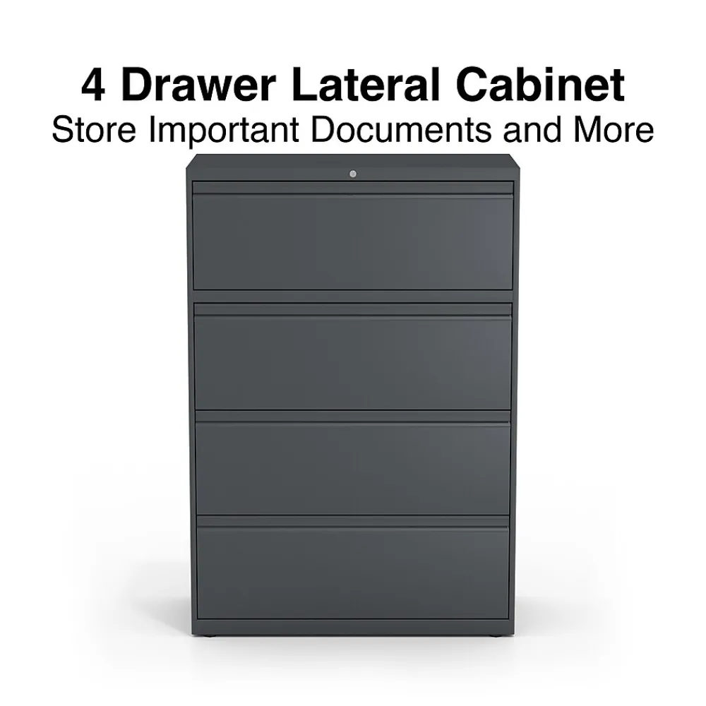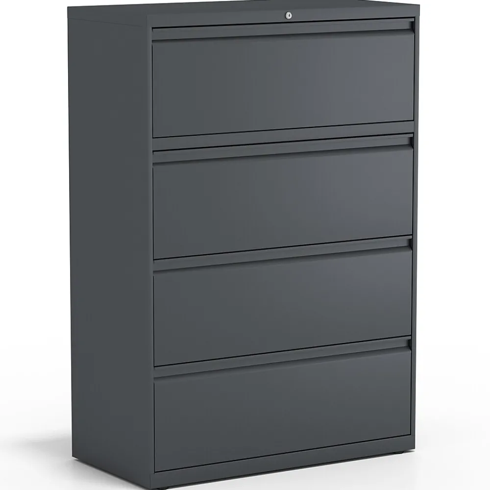 Keep paperwork organized inside this four-drawer file cabinet. Precision steel ball-bearing glides deliver smooth opening and closing, while the interlock system only allows one drawer to open at a time for added safety. Each drawer accepts letter, legal and A4 documents, providing flexible file storage options, and a core removable lock system makes it easy to keep sensitive information secure. This charcoal lateral file cabinet boasts adjustable hang rails to accommodate hanging file folders.