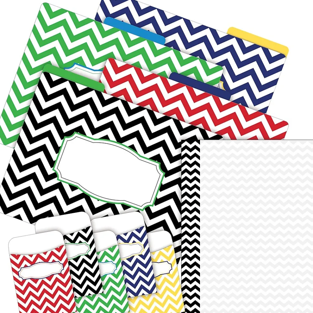 Barker Creek’s Chevron Nautical On-Trend Organizer Set will help you stay on task in style! Included in this popular set are 12 letter-sized fashion file folders — three each of four beautiful designs, 30 peel & stick coordinating library pockets — ten each of three colorful designs, and 50 sheets of coordinating computer paper. The file folders are printed on sturdy 12 point cardstock, feature 1/3 cut tabs, and are reversible. Each pocket has two self-adhesive peel & stick strips on the back and measures 5.1875″ H x 3.5″ W. The library pockets are great for organizing flash cards, hall passes, file folder game pieces, spelling word lists, library cards, reading logs, and more! The coordinating paper is compatible with most laser and inkjet printers and measures 8.5″ x 11″. Say goodbye to boring old office supplies and hello to fun and fashion! Coordinating products available: Search Barker Creek Chevron.