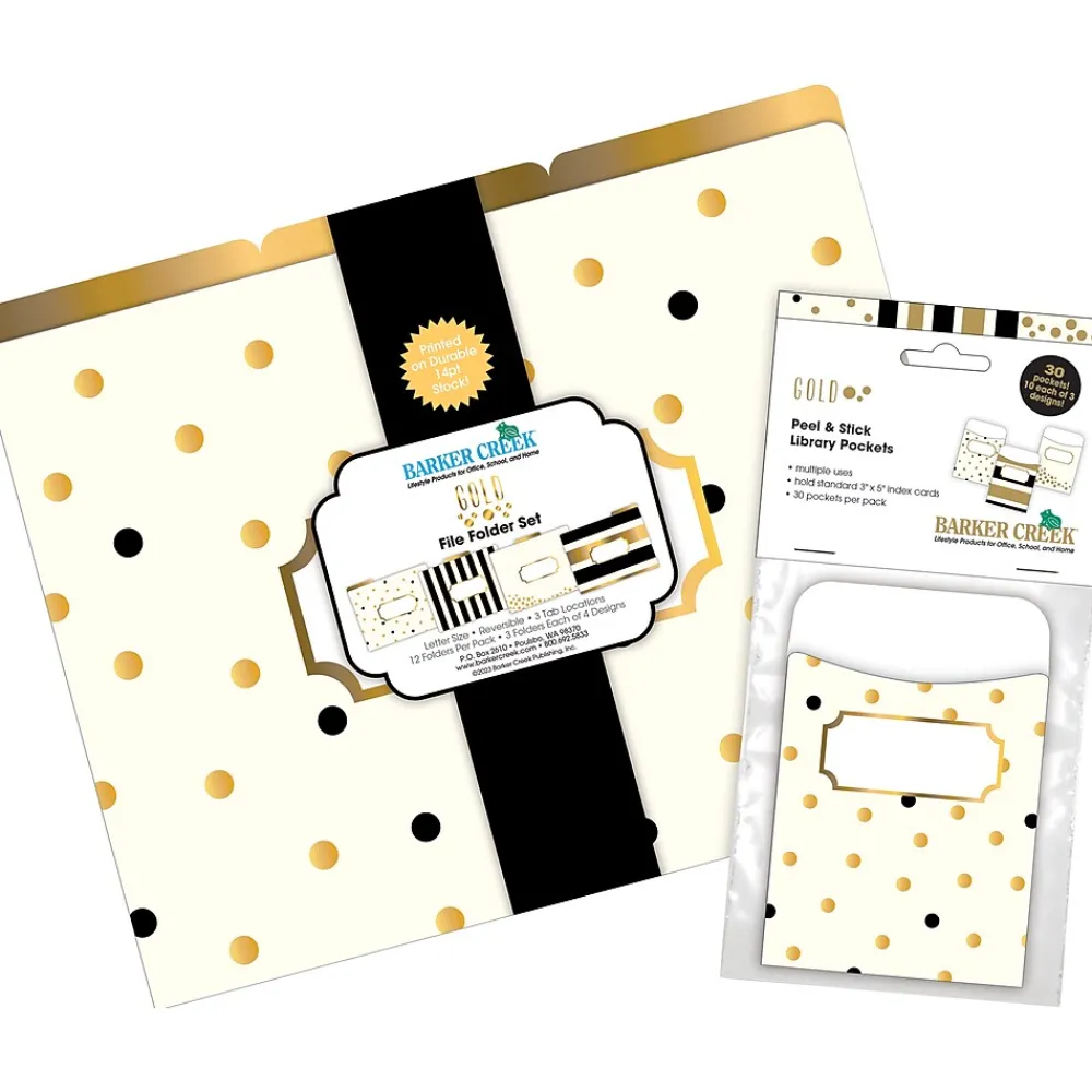 Barker Creek’s Gold Folder/Pocket Set is great for so many projects!The set includes 12 folders — three each of four beautiful designs and 30 peel & stick library pockets – ten each of three colorful designs.The file folders are printed on 14-point stock which makes them perfect for desktop filing, meeting handouts, and student papers. Create learning center activities and lapbooks, or simply add pockets to your folders for filing smaller items or keeping an index card size list. It’s easy to customize Barker Creek’s Folder/Pocket set to fit your needs and works well in any school, home, office, or dorm.Coordinating products available: Search Barker Creek Gold.