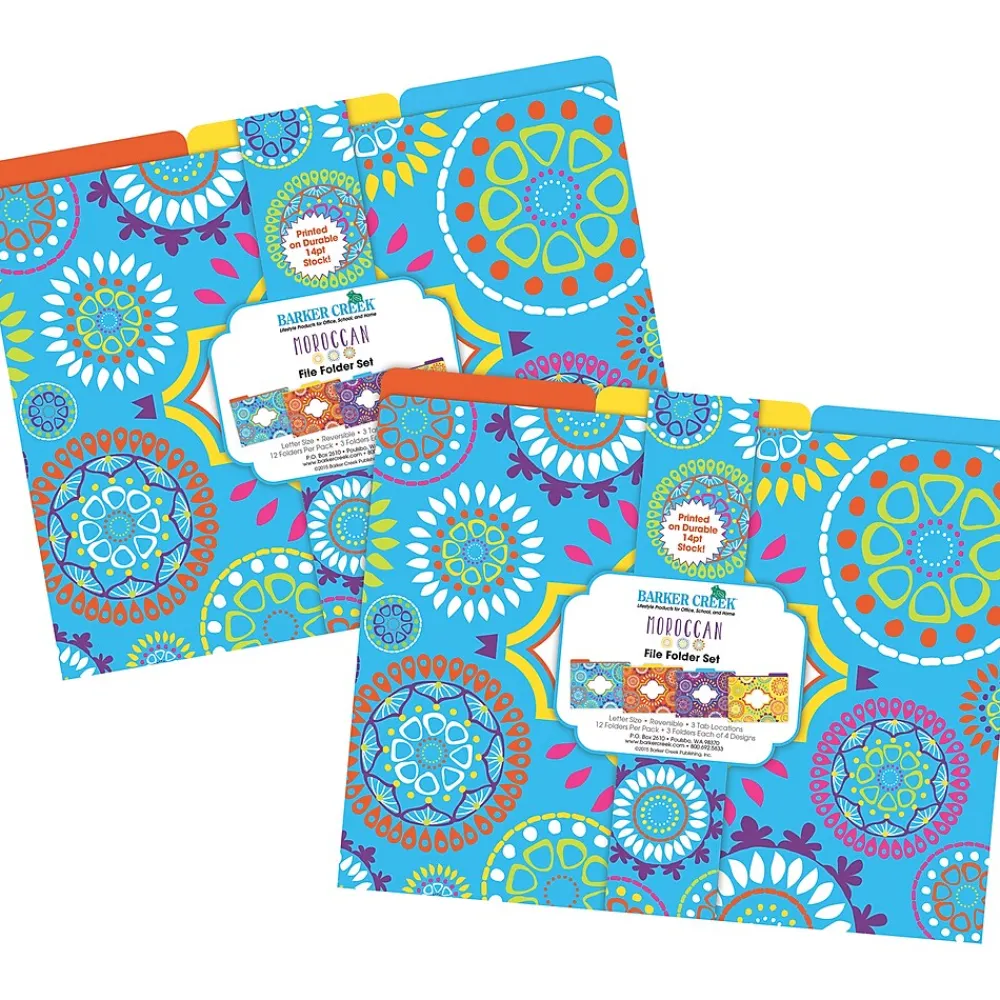 Barker Creek’s Moroccan Letter-Size File Folders are an affordable way to organize your office, classroom, or home with style and flair. This set of stylish desk accessories includes 24 file folders – six each of four colorful designs. The folders are 1/3 tabbed, which means that they have three tab positions – eight folders are tabbed on the left, eight folders are tabbed in the center, and eight are tabbed on the right. The 14-point stock makes these folders perfect for desktop filing, meeting handouts, and student papers. These Moroccan file folders come with a preprinted “label” on the front for adding a table of contents, highlighting meeting agendas, listing the names of team members, bulleting travel itineraries, and so much more. These unique office supplies are fully reversible, each folder having a multicolored design on one side and a vibrant, solid color on the reverse side. The possibilities are limited only by your imagination! Coordinating products are available. Search: Barker Creek Moroccan.