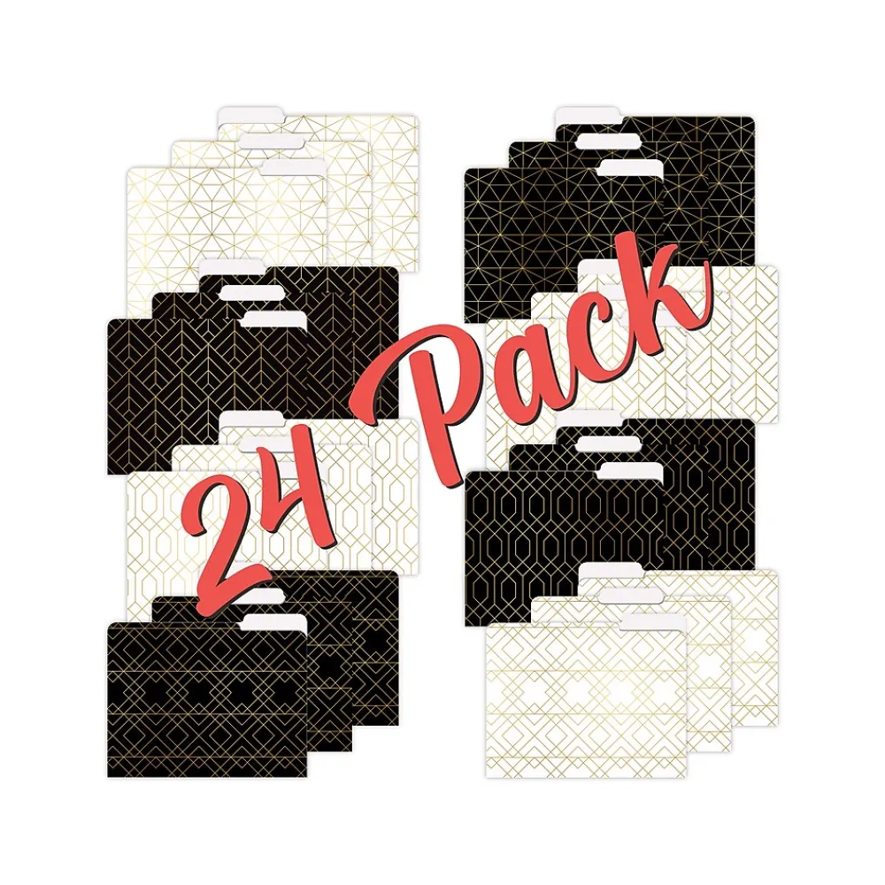 - Features unique prints of four eye-catching Geometric Gold Foil designs on a black background and white background (eight sets of three matching folders)